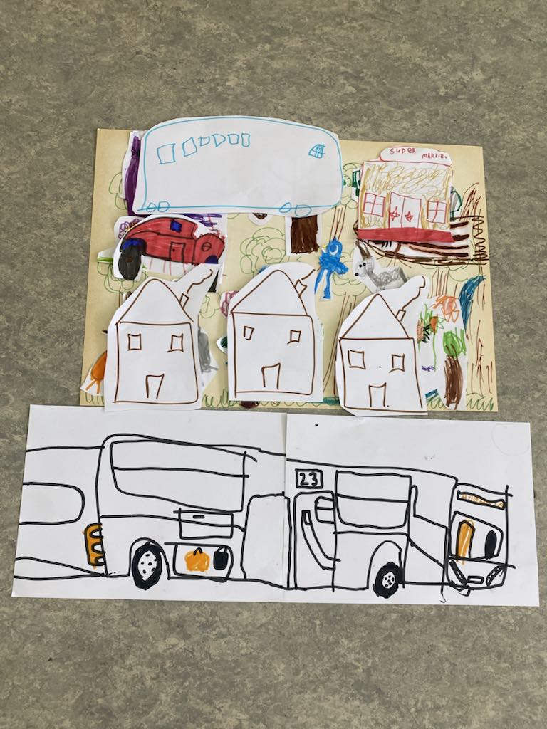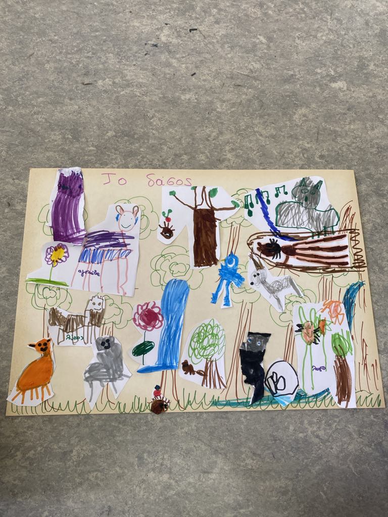 Ξεκινήσαμε φτιάχνοντας ένα οικοσύστημα, το δάσος. Ζωγραφίσαμε το δάσος και  τα ζώα που ζουν σ’ αυτό , τις φωλιές τους, την τροφή τους κλπ. Στη συνέχεια μιλήσαμε για την ανθρώπινη δραστηριότητα και τις συνέπειες που έχει στο οικοσύστημα.  Ζωγραφίσαμε σπίτια, αυτοκίνητα, εργοστάσια, δρόμους, λεωφορεία, σούπερ μάρκετ τα οποία εξαπλώθηκαν και εξαφάνισαν το δάσος και τα ζώα.