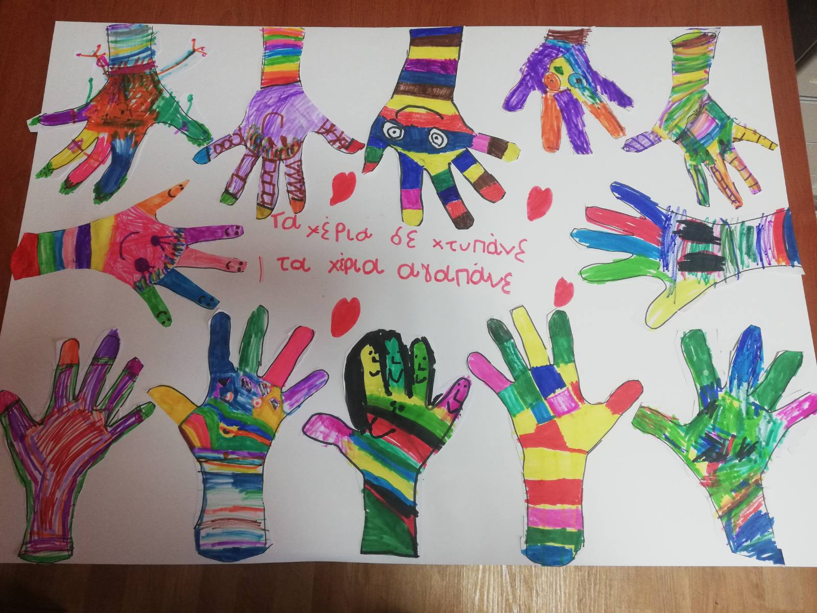 Με αφορμή την ημέρα κατά της σχολικής βίας και του εκφοβισμού διαβάσαμε το παραμύθι “τα χέρια δεν χτυπάνε τα χέρια αγαπάνε”. Συζητήσαμε για τις μορφές του σχολικού εκφοβισμού καθώς και για τους τρόπους αντιμετώπισης.