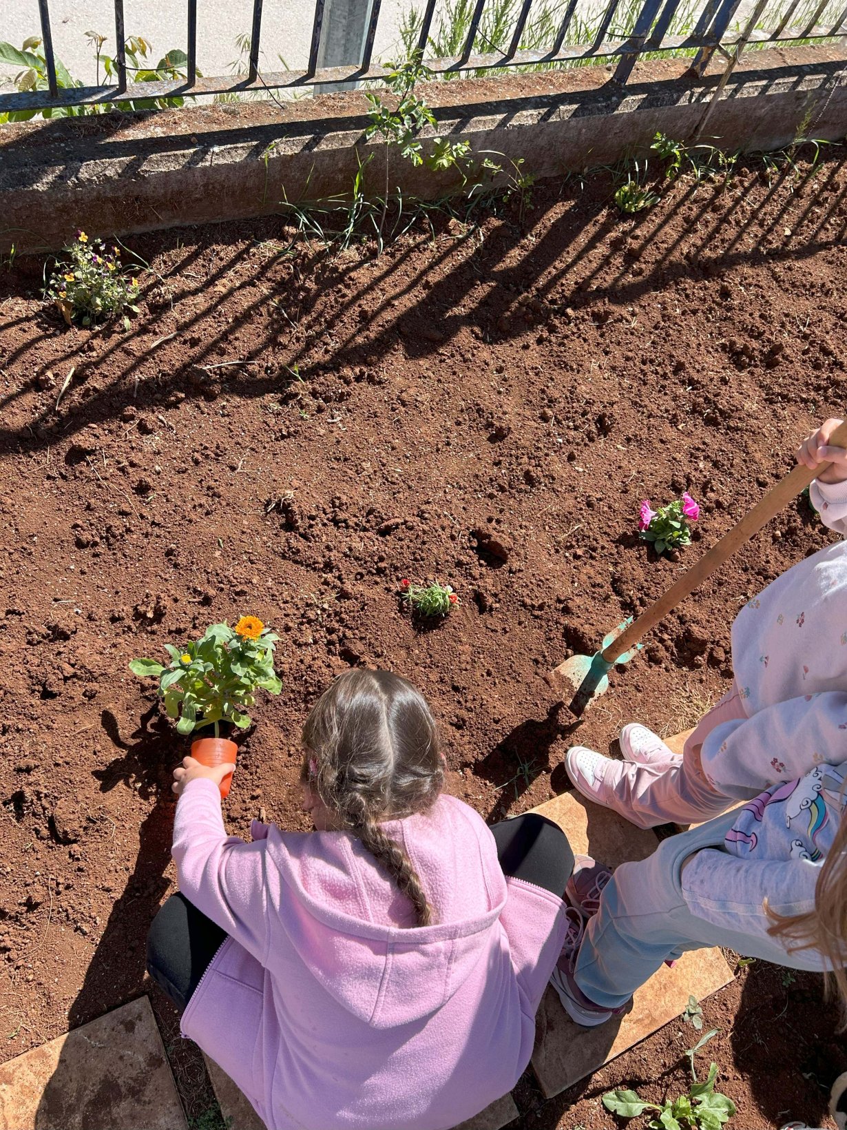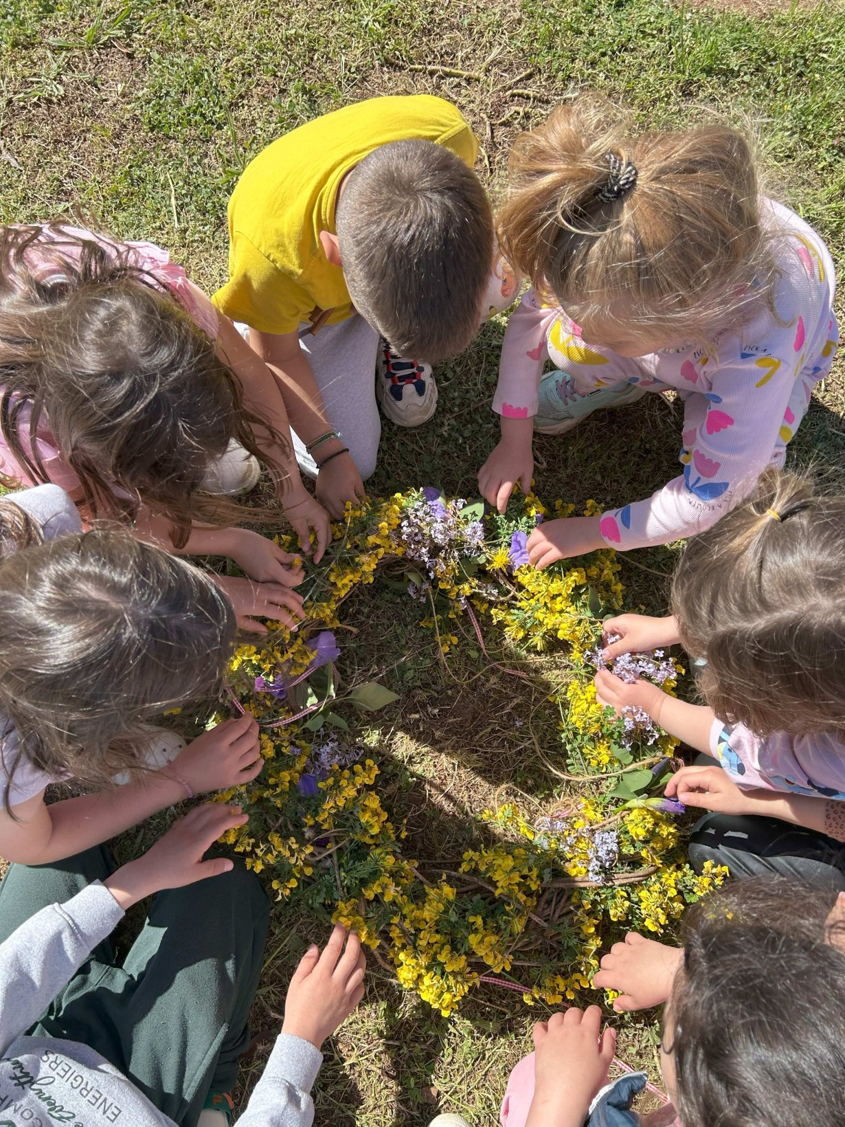 Αφού λοιπόν μαζέψαμε και τα τελευταία λαχανικά από το θερμοκήπιο ξεκινήσαμε να προετοιμάζουμε τον κήπο μας για να υποδεχτεί τα λουλούδια της άνοιξης. Αρχικά σκαλίσαμε και ανανεώσαμε το χώμα, ρίξαμε λίπασμα από τον κομποστοποιητή μας και φυτέψαμε τα λουλούδια που έφεραν τα παιδιά. Καθώς περίσσεψαν αρκετά λουλούδια αποφασίσαμε να φτιάξουμε ένα δεύτερο ανθόκηπο στην άλλη μεριά της αυλής μας. Τα παιδιά είχαν τη χαρά για άλλη μια φορά να εξοικοιωθούν με τα εργαλεία του κήπου, να μάθουν ονόματα λουλουδιών, να ταξινομήσουν με βάση το χρώμα, να μετρήσουν τα λουλούδια, να μάθουν για την ανάπτυξη και φροντίδα των φυτών μέσα από μια βιωματική διαδικασία. Αποφάσισαν να φτιάξουν και πάλι πινακίδες για τη φροντίδα του κήπου και χωρίσαμε τις αρμοδιότητες ανά τμήμα. Φτιάξαμε επίσης μαγιάτικο στεφάνι με τα αγριολούλουδα της αυλή μας.