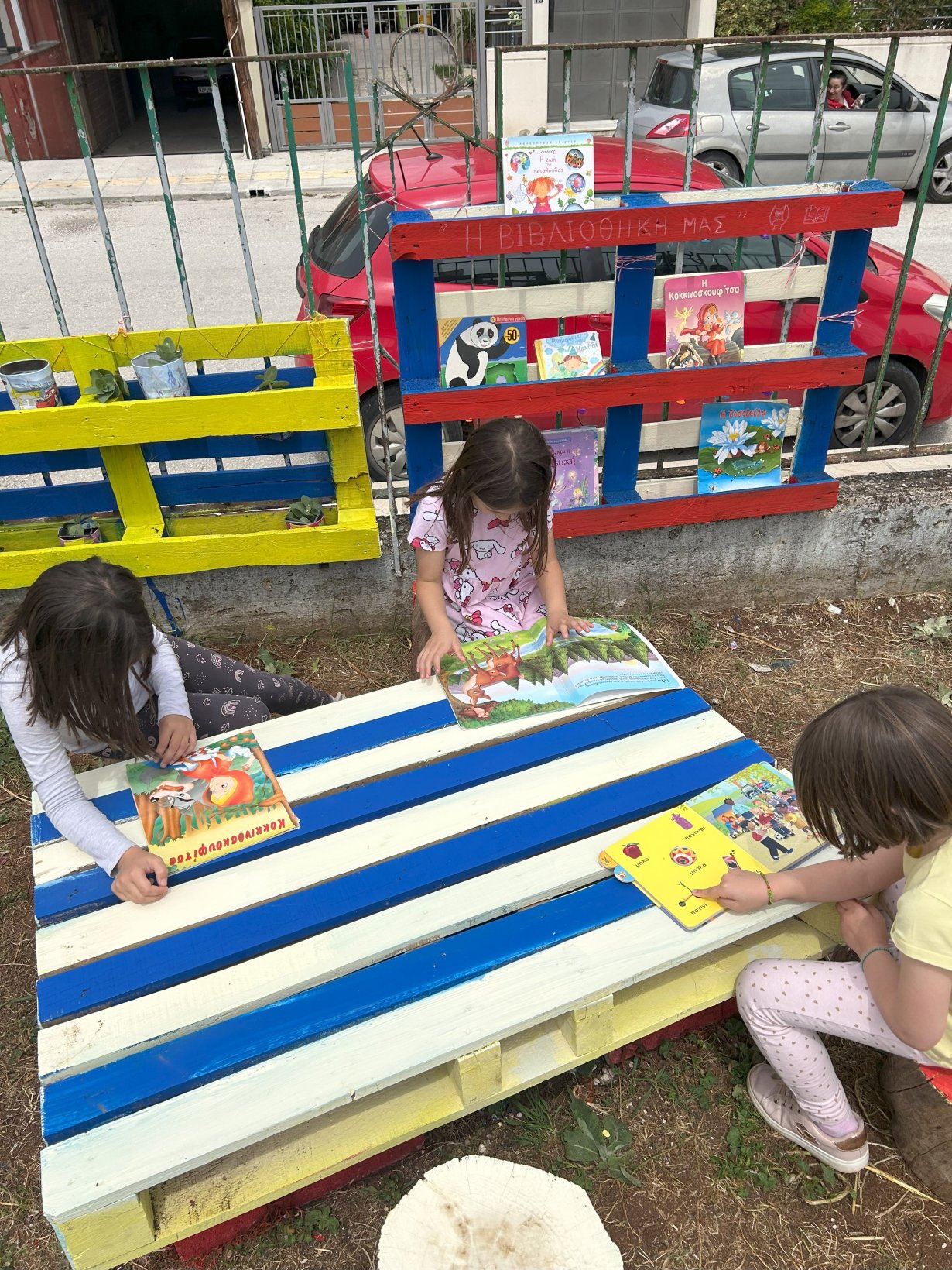 Για να απολαμβάνουμε τον κήπο μας φτιάξαμε με παλέτες και κορμούς ένα τραπεζάκι με καθίσματα, αλλά και μία μικρή βιβλιοθήκη για να μπορούν τα παιδιά να διαβάσουν τις ώρες που είμαστε στην αυλή.