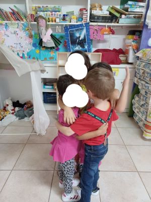 Στόχος του παιχνιδιού είναι να μην μείνει κανένα παιδί έξω από το παιχνίδι και στο τέλος όλοι μαζί να γίνουν μια μεγάλη αγκαλιά ( κάθε παιδί χορεύει γύρω από την καρέκλα του. όταν σταματήσει η μουσική και έχει αφαιρεθεί μία καρέκλα το παιδί που δεν έχει προλάβει θα πρέπει να καθίσει με κάποιο άλλο ώστε να μην μείνει μόνο του και αυτό συνεχίζεται μέχρι να μείνει μία καρέκλα και να ενωθούνε όλα τα παιδιά μαζί σε μία αγκαλιά )
