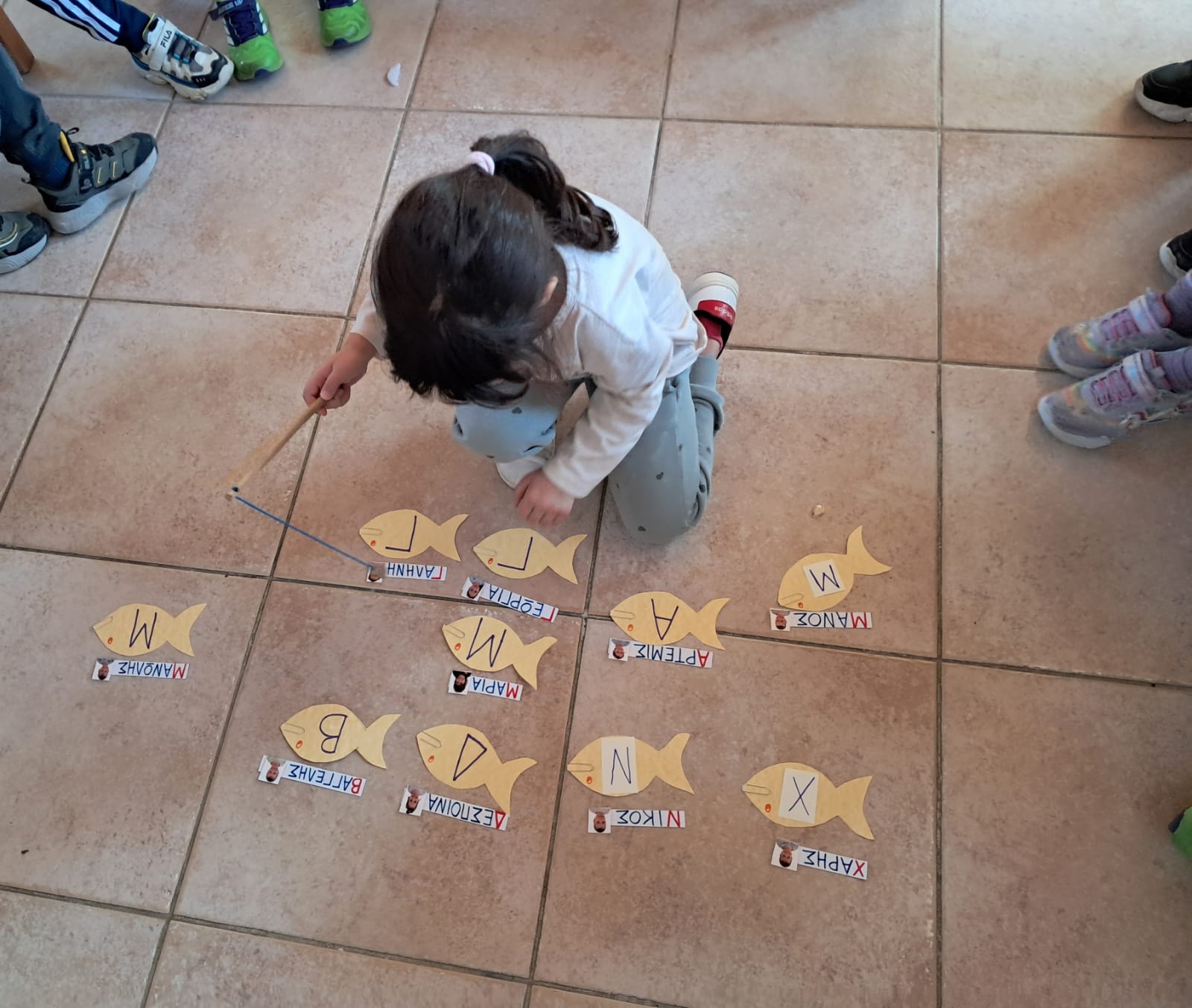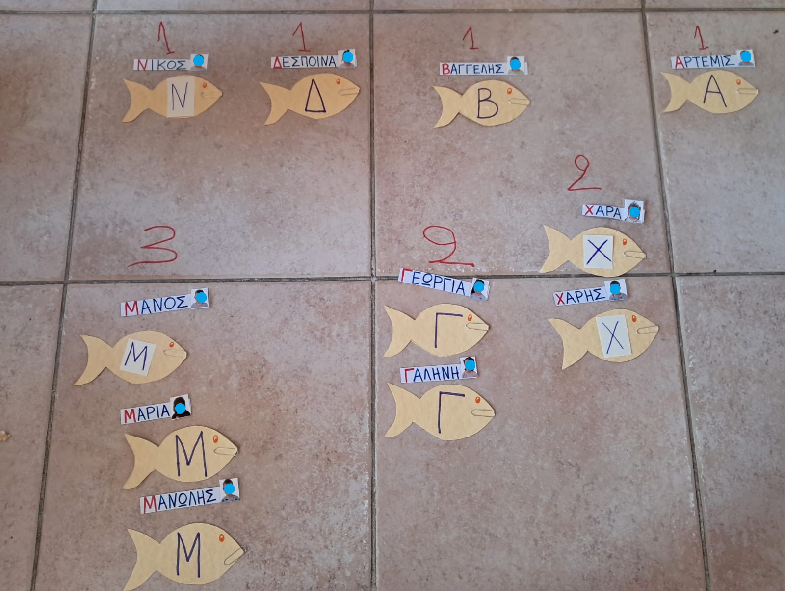 Αρχικά παρατηρήσαμε την καρτούλα με το όνομά μας, εντοπίσαμε ποιο είναι το αρχικό μας γράμμμα και ψάξαμε στην τάξη που ήταν κρυμμένα τα ψαράκια με το αρχικό μας γράμμα…φυσικά τα ψαρέψαμε!!!