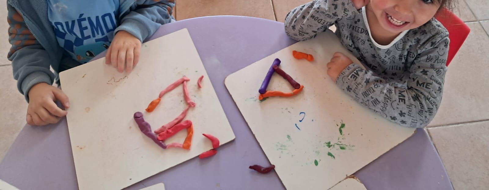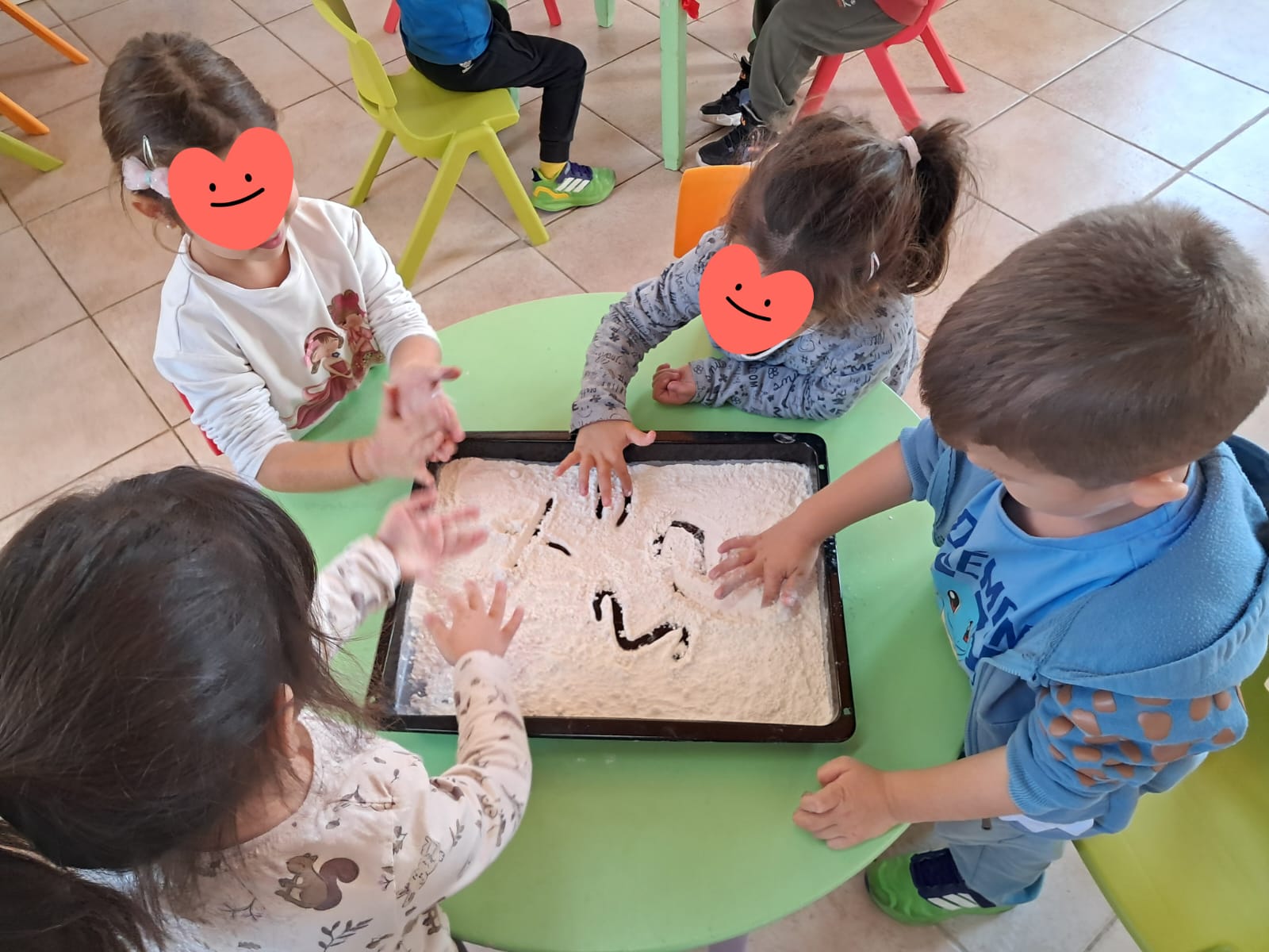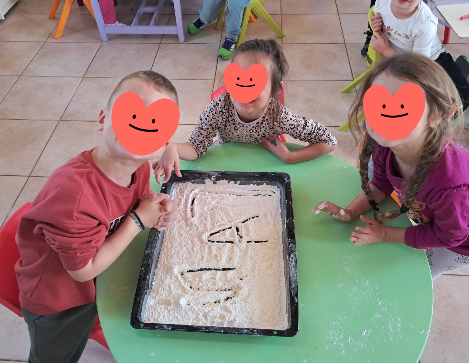 Το γράψαμε με τα δάχτυλα μας σε ένα ταψί με αλεύρι και πολύ μας άρεσε!!!