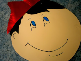 Φτιάχνουμε σε ένα μεγάλο χαρτόνι το πρόσωπο του Πινόκιο χωρίς τη μυτούλα. Κάπως έτσι: