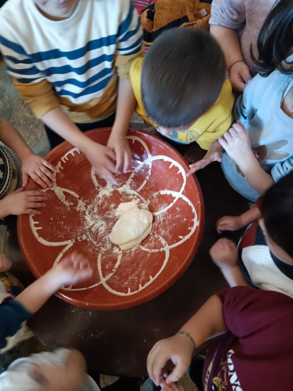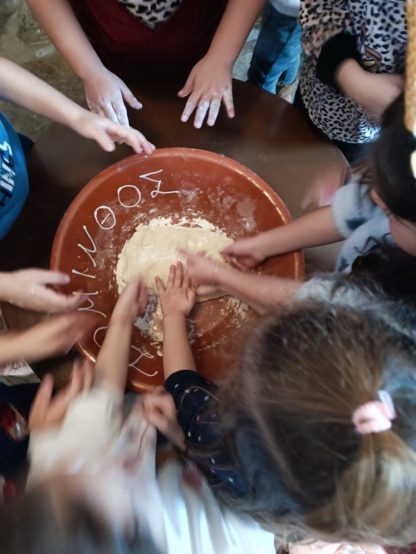 Το Μανολιό έκανε πολλές κουτουράδες και η μαμά του για να τον συνετίσει του ζήτησε να την βοηθήσει για να ζυμώσει ψωμί! Εμείς πρόθυμοι όπως πάντα, θελήσαμε να βοηθήσουμε στο ζύμωμα του ψωμιού! Ζυμώσαμε στην λεκανίδα, πλάσαμε τα ψωμάκια μας και τα φουρνίσαμε στον ξυλόφουρνο! Ήταν το πιο “γλυκό” ψωμί που έχουμε δοκιμάσει! Το Μανολιό, όμως, δεν μπορούσε να βγάλει από το μυαλό του το μαγικό φίλτρο που θα τον έκανε πλούσιο… κι έτσι, αποκάλυψε στην μαμά του όλα όσα μας είπε ο μπλε άνθρωπος! Η μαμά του τότε, του εξήγησε ότι πλούσιος δεν γίνεσαι μόνο όταν έχεις χρήματα αλλά όταν έχεις ανθρώπους δίπλα σου να σε αγαπούν και να νοιάζονται για ‘σένα. Φτιάξαμε ένα μεγάλο κύκλο, πιάσαμε τα χέρια και είπαμε ο ένας στο αυτί του άλλου μία μαγική λέξη… “σ’ αγαπώ“! Νιώσαμε όλοι τόσο πλούσιοι!!