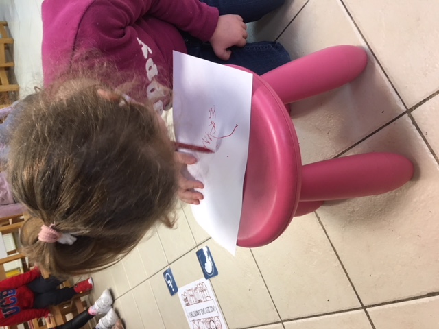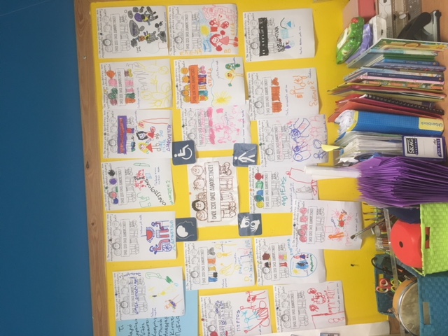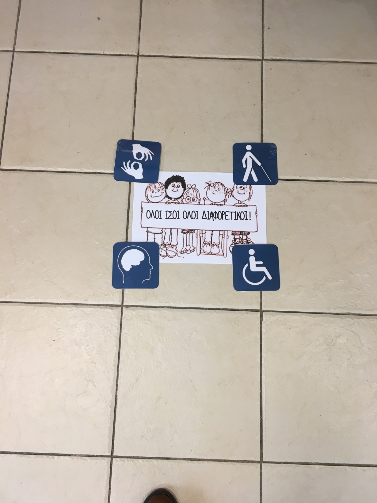 Παρακολουθήσαμε βίντεο από το διαδίκτυο με άτομα που αντιμετωπίζουν δυσκολίες όρασης, ακοής, κίνησης. Είδαμε πως επικοινωνούν οι άνθρωποι αυτοί και πως λειτουργούν στην καθημερινότητα τους( νοηματική, σύστημα Braille, αναπηρικό αμαξίδιο ). Στο τέλος τέθηκε στα παιδια ο προβληματισμός αν ερχόταν στο σχολείο μας ένα παιδί με αναπηρικό αμαξίδιο τι θα μπορούσαμε να παίξουμε μαζί του. Τα παιδιά αποτύπωσαν τις ιδέες τους ζωγραφίζοντας και κατέληξαν ότι θα έπαιζαν μαζί του όπως παίζουν και με τα υπόλοιπα παιδιά γιατί μπορεί να είμαστε διαφορετικοί αλλά είμαστε και ίσοι!