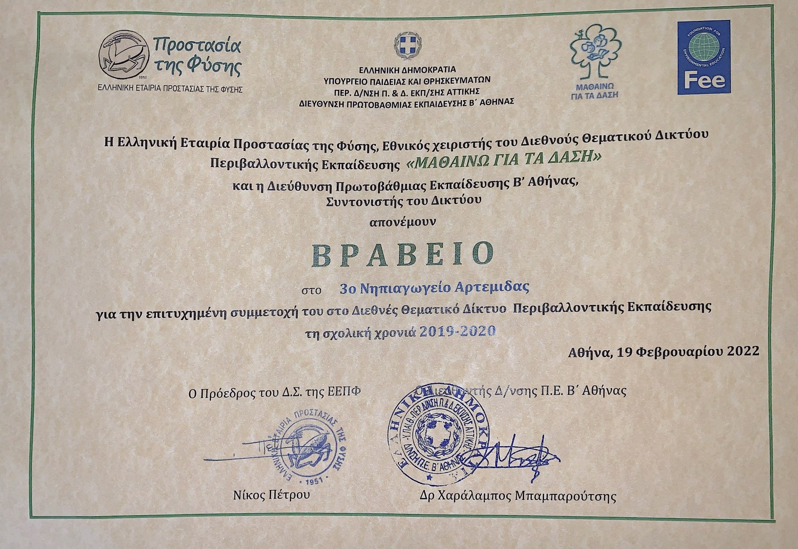 Με χαρά παραλάβαμε το βραβείο του σχολείου μας από τη συμμετοχή μας στο Διεθνές Θεματικό Δίκτυο Περιβαλλοντικής Εκπαίδευσης “ΜΑΘΑΙΝΩ ΓΙΑ ΤΑ ΔΑΣΗ” της Ελληνικής Εταιρίας Προστασίας της Φύσης για τη σχολική χρονιά 2019-2020. Το βραβείο απονεμείθηκε στις 19 Φεβρουαρίου 2022 σε διαδικτυακή εκδήλωση. Μαζί παραλάβαμε και το σακίδιο του δικτύου.