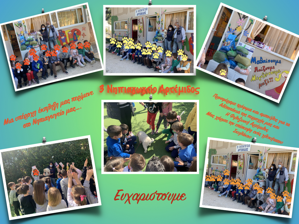 Με αφορμή την Παγκόσμια Ημέρα των Ζώων παιδιά και γονείς του 3ου Νηπιαγωγείου Αρτέμιδος συγκέντρωσαν τροφές και κουβερτούλες για τα αδέσποτα ζωάκια του Δήμου μας. Ευχαριστούμε την κυρία Έβελιν από το φιλοζωικό σωματείο Αρτέμιδος που μας επισκέφθηκε και μας μίλησε για την έννοια του εθελοντισμού και τις ανάγκες των ζώων.