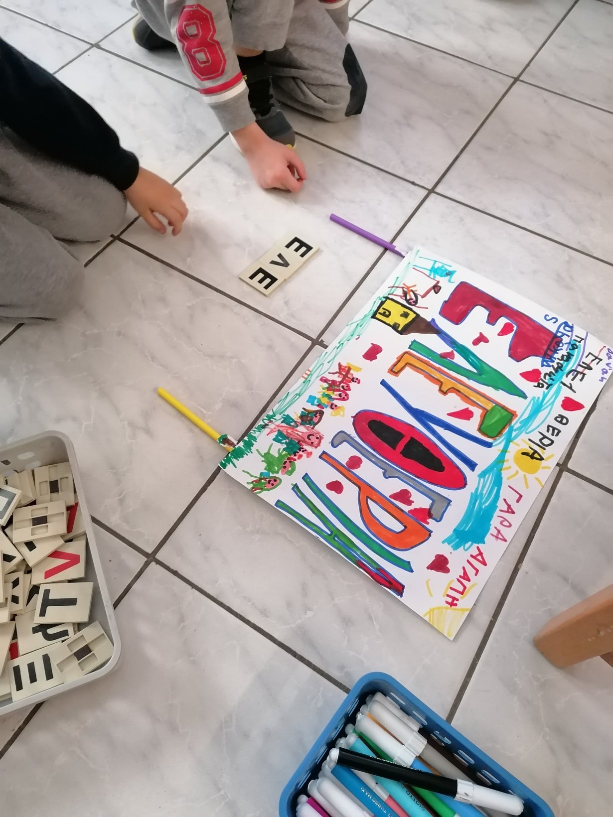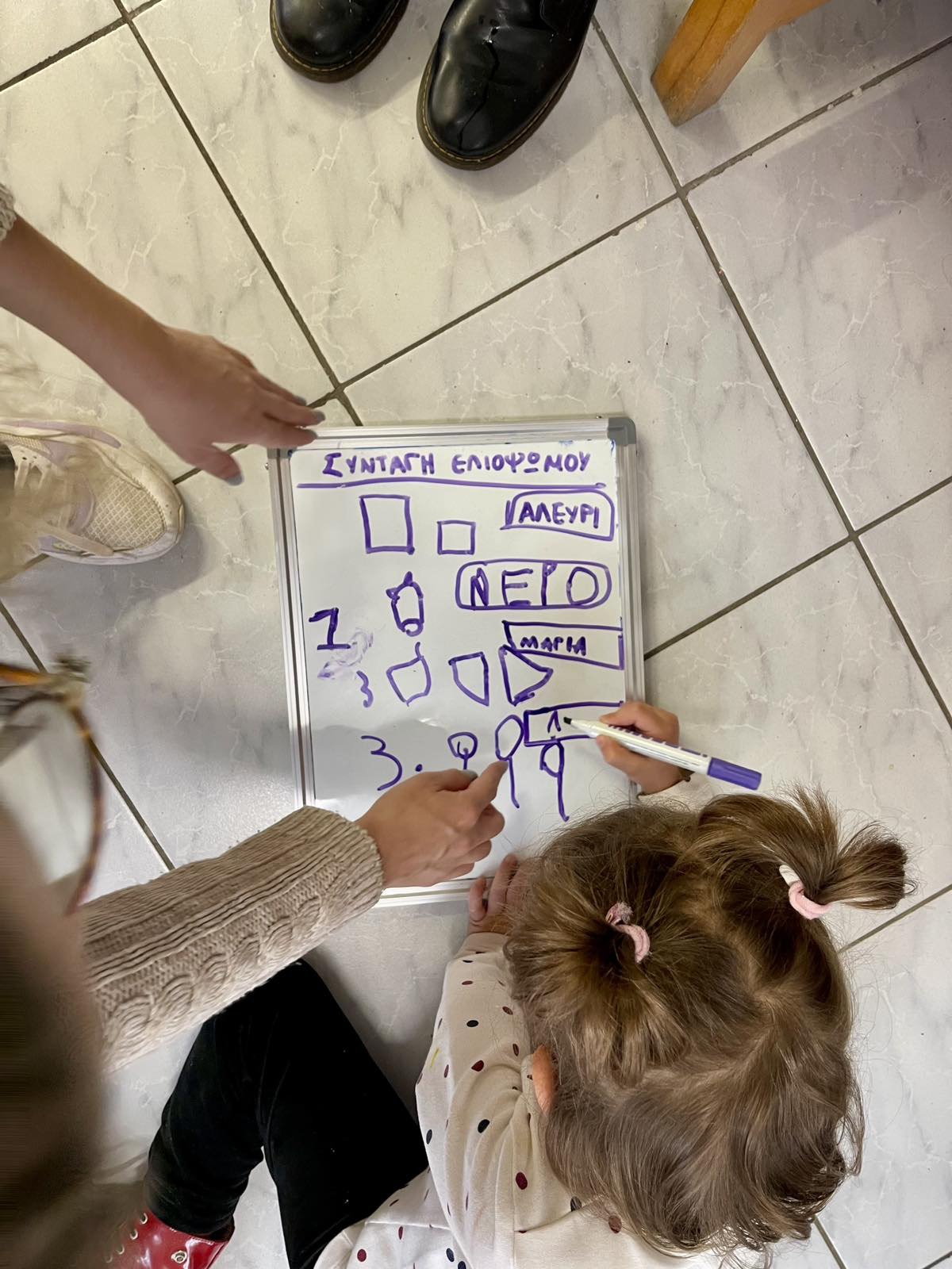 και γράψαμε τη λέξη “ελιά” με μαρκαδόρους, τουβλάκια και μαγνητάκια.