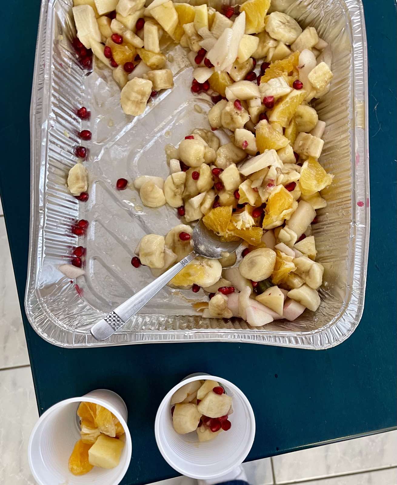 Με αφορμή τα φρούτα φτιάξαμε όλοι μαζί μια θρεπτική φρουτοσαλάτα. Τα παιδιά παρατήρησαν τα χρώματα, τις μυρωδιές και τις γεύσεις των φρούτων, ανέλαβαν ρόλους στην παρασκευή και έμαθαν πως μπορούμε να δημιουργούμε υγιεινά σνακ.