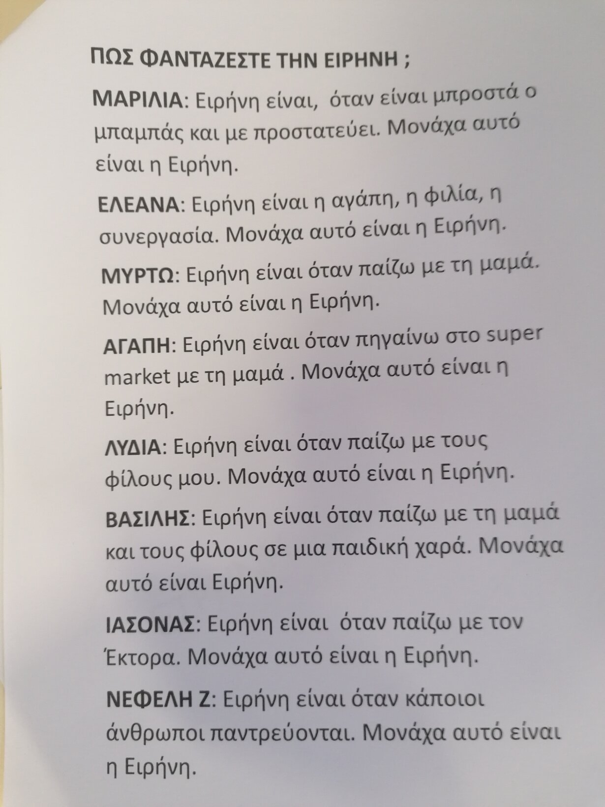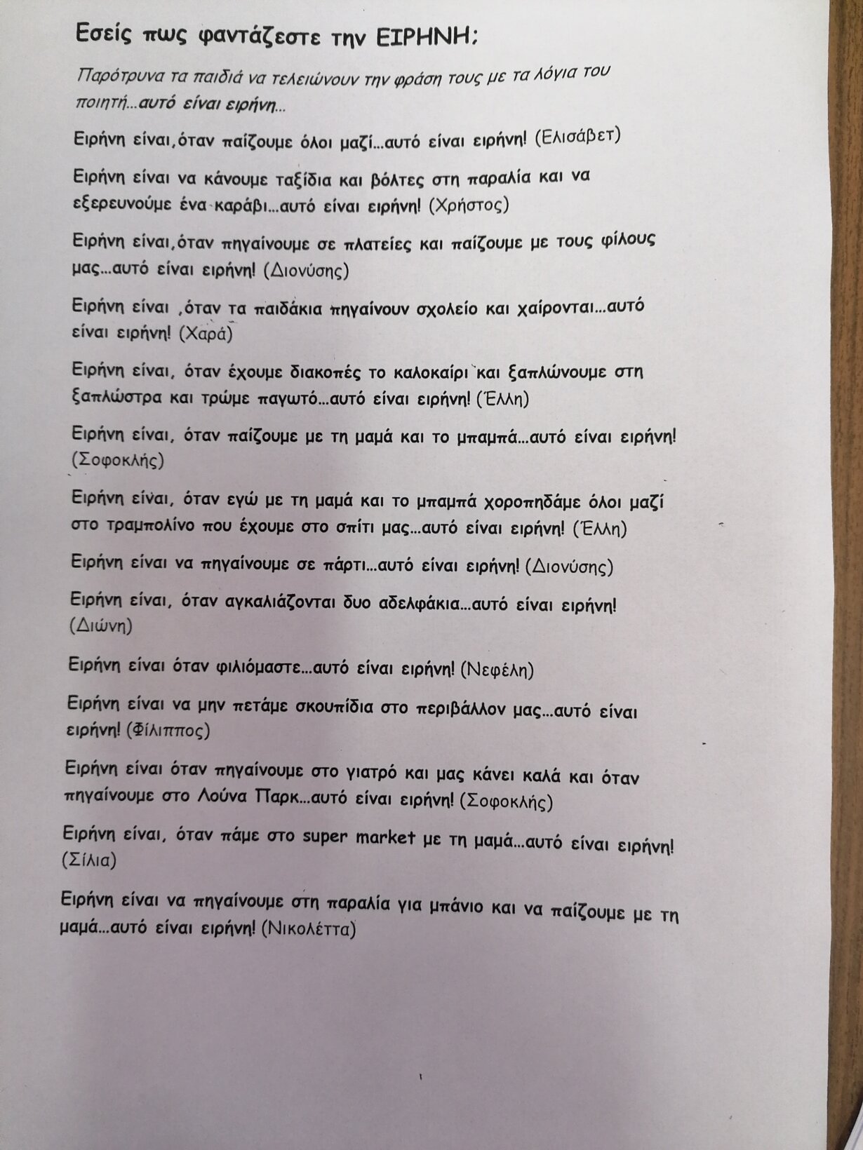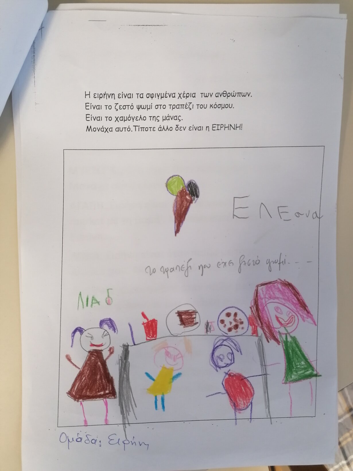 Ακούσαμε τον ποιητή Γ.Ρίτσο να απαγγέλλει ο ίδιος το ποίημά του “Ειρήνη” και στην συνέχεια επεξεργαστήκαμε αποσπασματικά το κείμενο του ποιήματος. Τα παιδιά χωρίστηκαν σε τέσσερεις (4) ομάδες στις οποίες έδωσαν όνομα και συνεργάστηκαν προκειμένου να αποδώσουν ζωγραφικά τους συγκεκριμένους στίχους. Στην συνέχεια τα παιδιά εξέφρασαν δικές τους απόψεις και ιδέες για την ειρήνη. Έτσι δημιουργήσαμε ένα …βιβλίο για την ΕΙΡΗΝΗ!