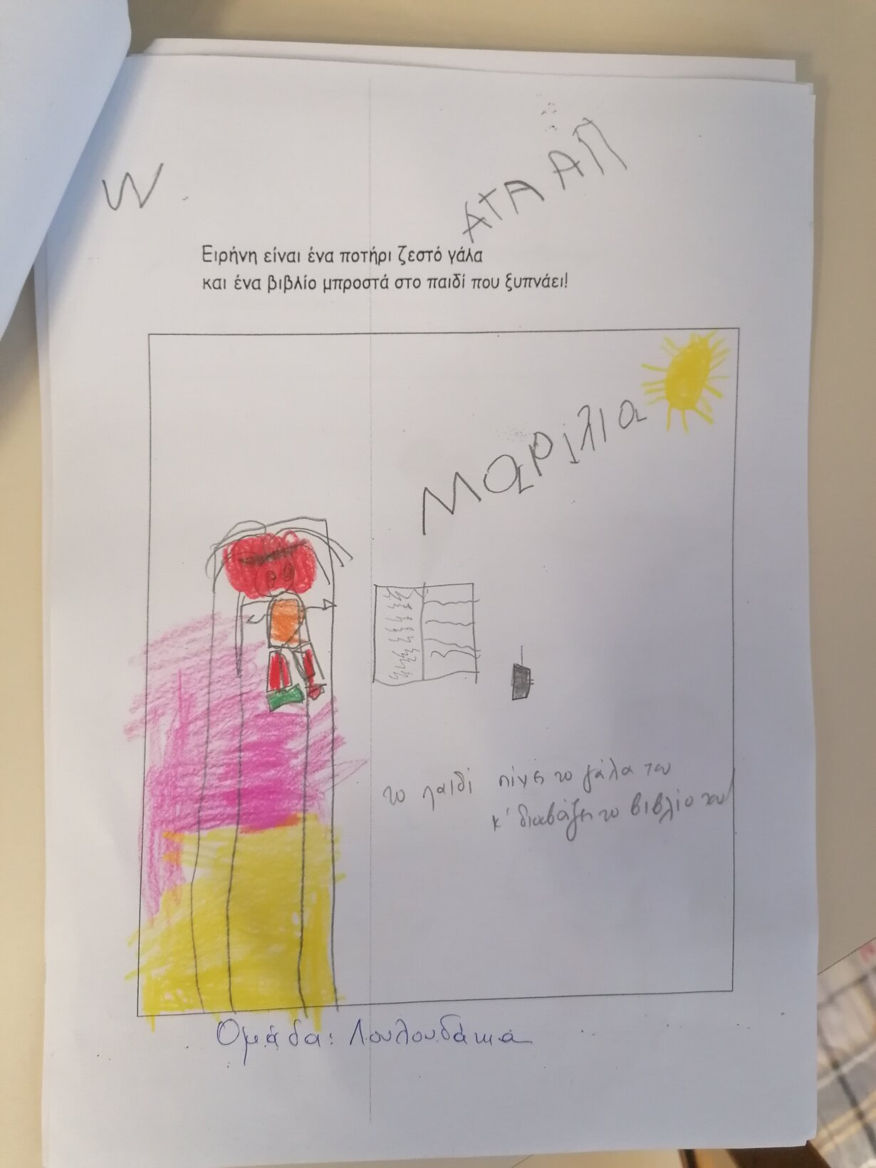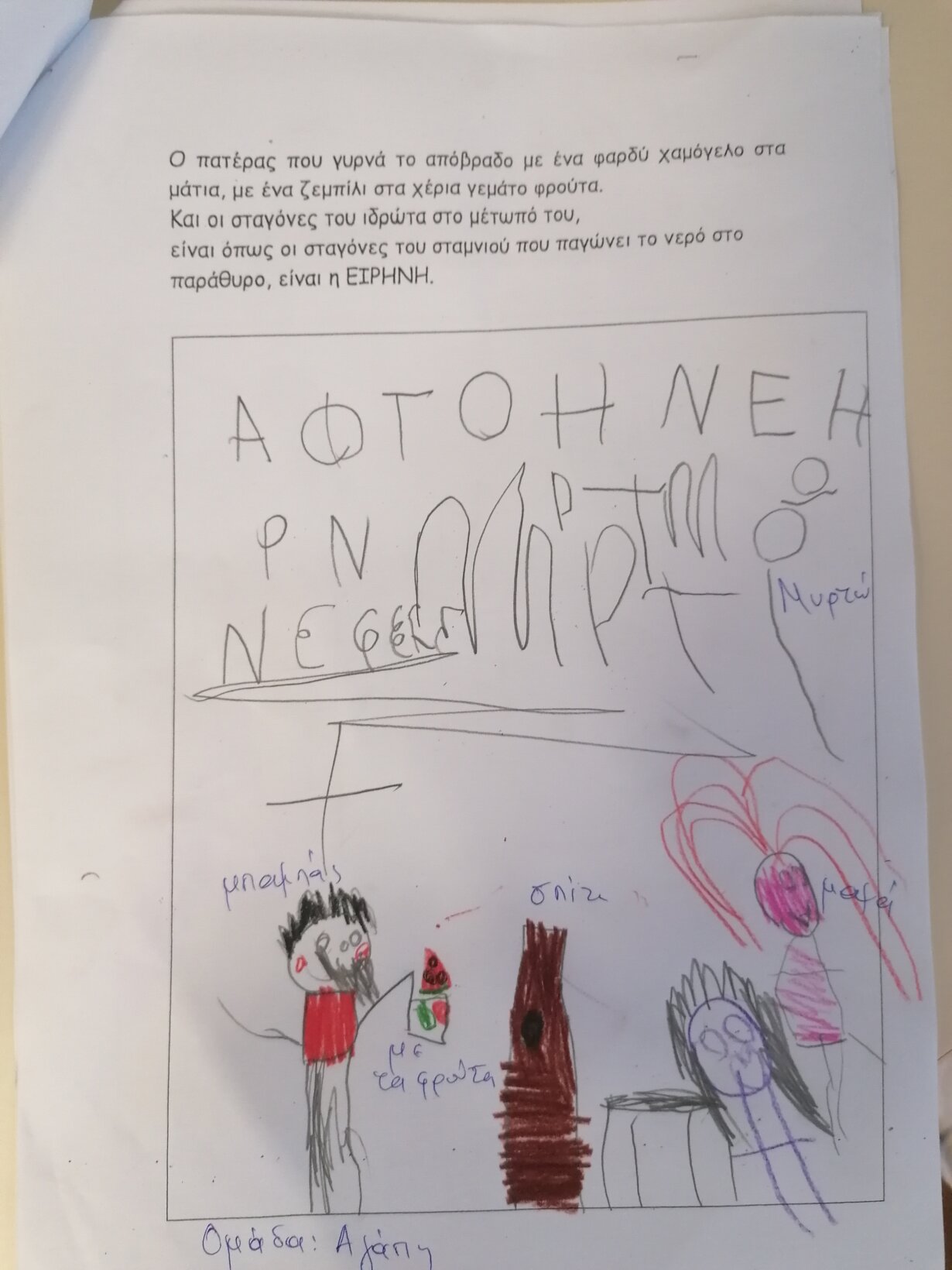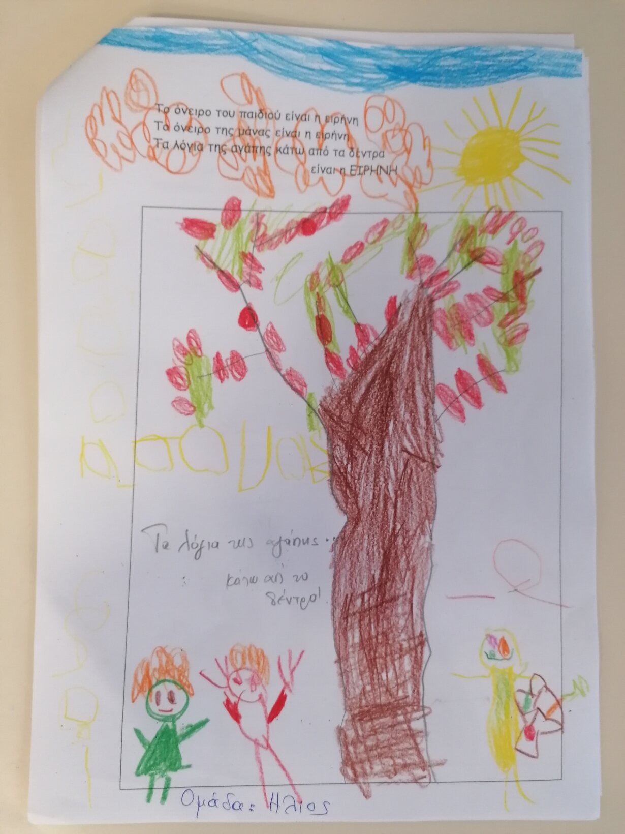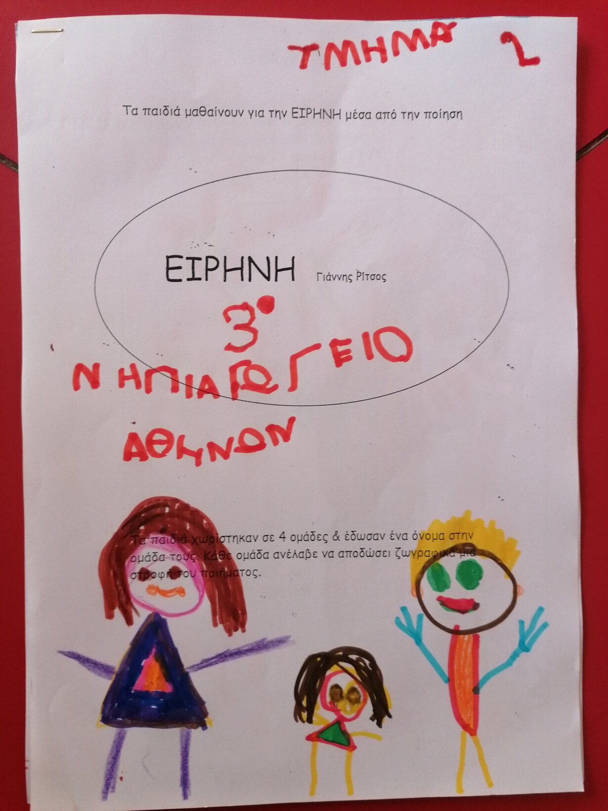 Ακούσαμε τον ποιητή Γ.Ρίτσο να απαγγέλλει ο ίδιος το ποίημά του “Ειρήνη” και στην συνέχεια επεξεργαστήκαμε αποσπασματικά το κείμενο του ποιήματος. Τα παιδιά χωρίστηκαν σε τέσσερεις (4) ομάδες στις οποίες έδωσαν όνομα και συνεργάστηκαν προκειμένου να αποδώσουν ζωγραφικά τους συγκεκριμένους στίχους. Στην συνέχεια τα παιδιά εξέφρασαν δικές τους απόψεις και ιδέες για την ειρήνη. Έτσι δημιουργήσαμε ένα …βιβλίο για την ΕΙΡΗΝΗ!