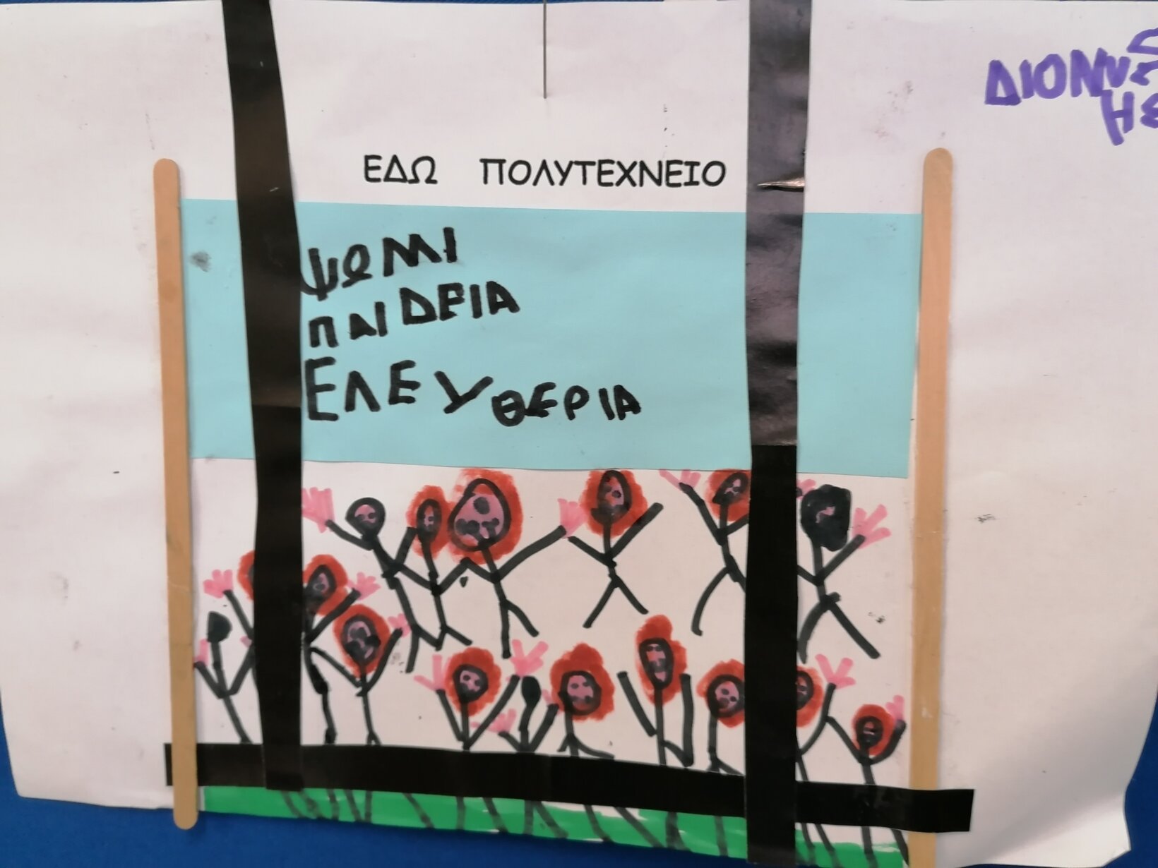 Εδώ Πολυτεχνείο…Τα παιδιά ζωγραφίζουν τους φοιτητές και αντιγράφουν στο πανό το βασικό τους σύνθημα Ψωμί- Παιδεία- Ελευθερία (λέξεις με νόημα)!