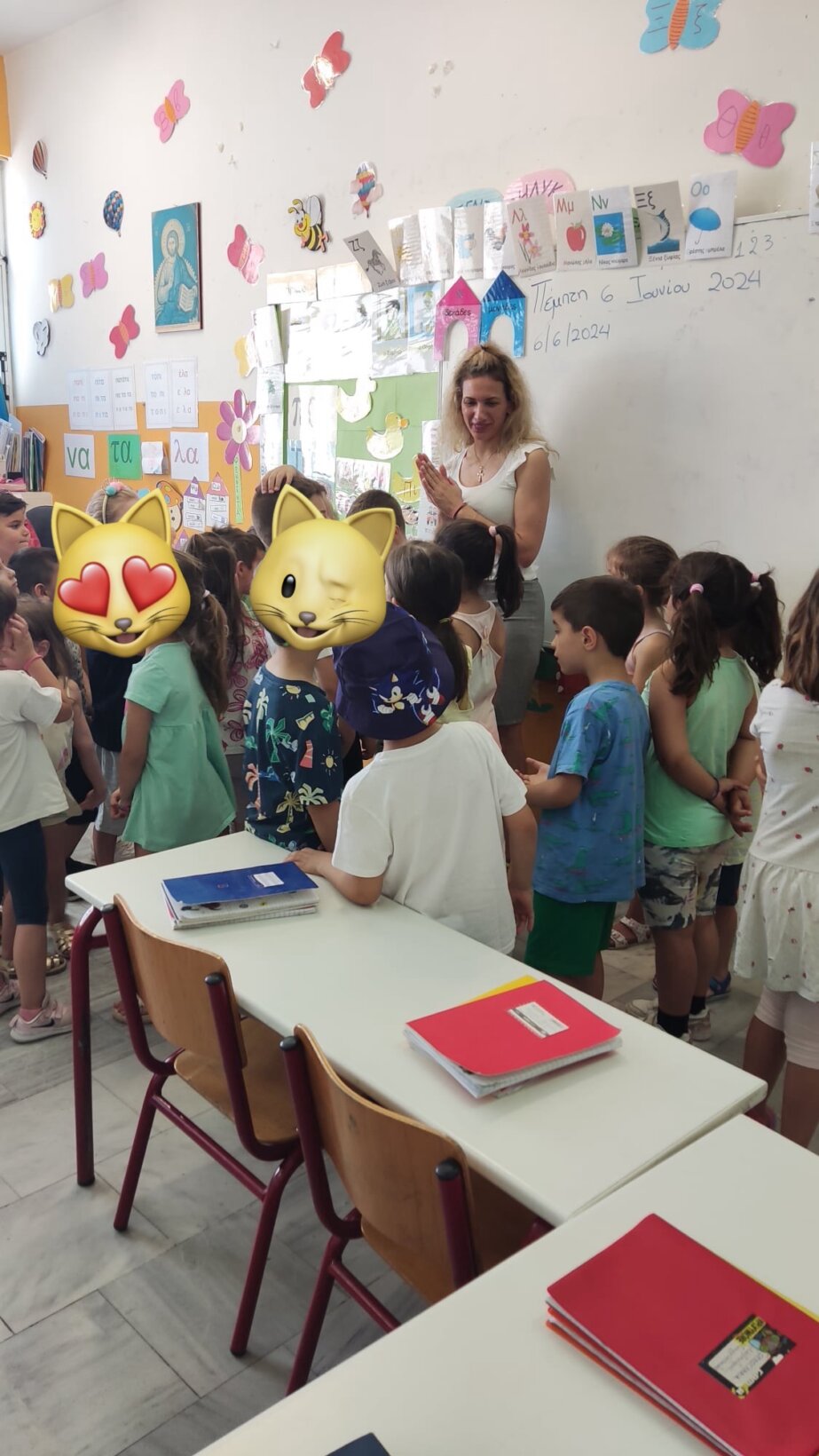 Σειρά είχαν μετά οι τάξεις της πρώτης , η κυρία Γιώτα και η κα Ιωάννα μας περίμεναν με χαρά μας διαβεβαίωσαν ότι το μάθημα είναι γιορτή , αφού έχουν μικρόφωνο για να μιλάνε τα παιδιά , μαγικό πίνακα (ο διαδραστικός ) που γράφεις με στυλό και σβήνει με το χέρι! Ενθουσιαστήκαμε και πήραμε δωρο μια τεράστια ομαδική κάρτα και άλλες μικρές για να θυμόμαστε τα πρωτάκια, τους περσινούς συμμαθητές μας τους οποίους θα συναντήσουμε το Σεπτέμβρη!