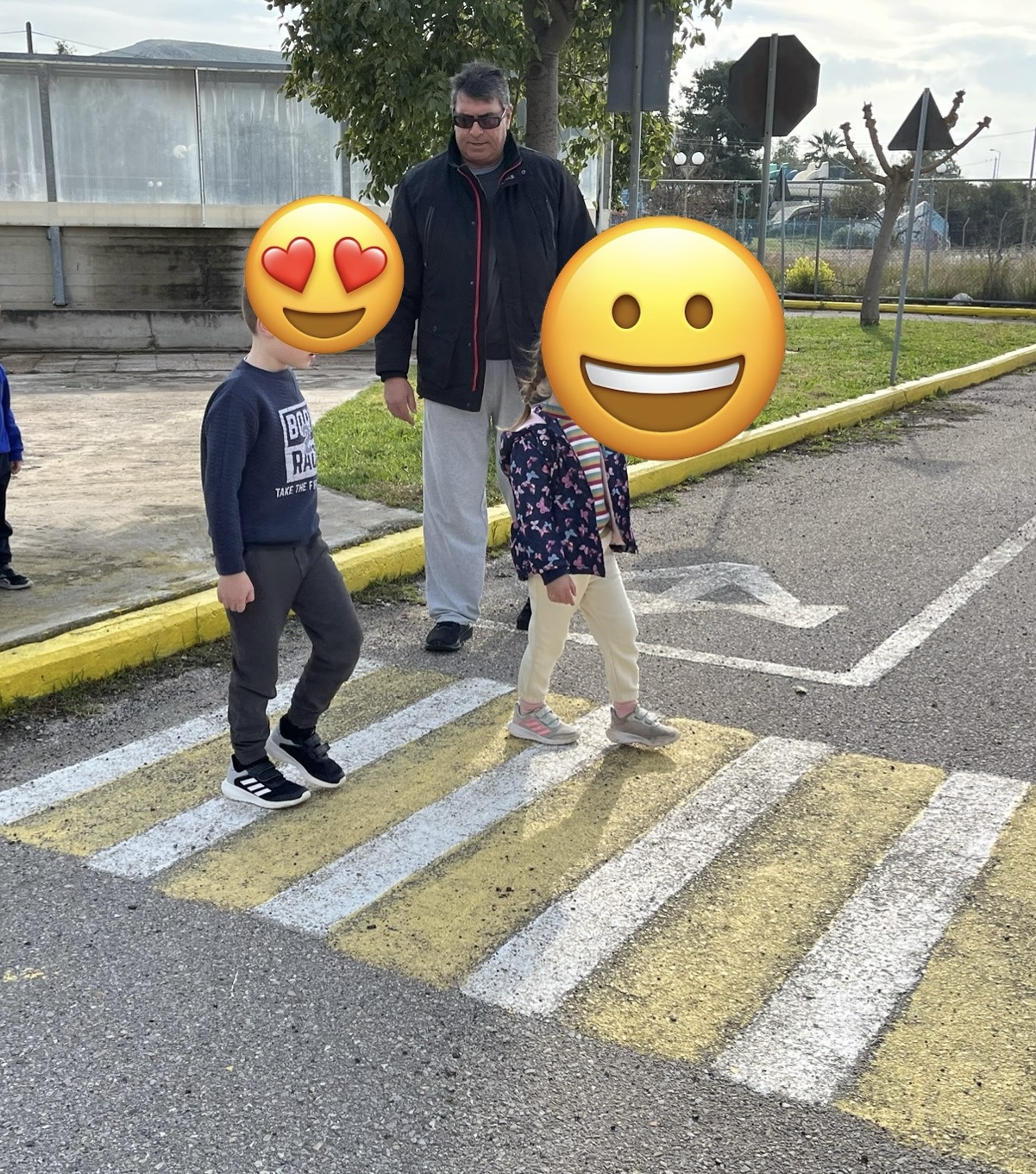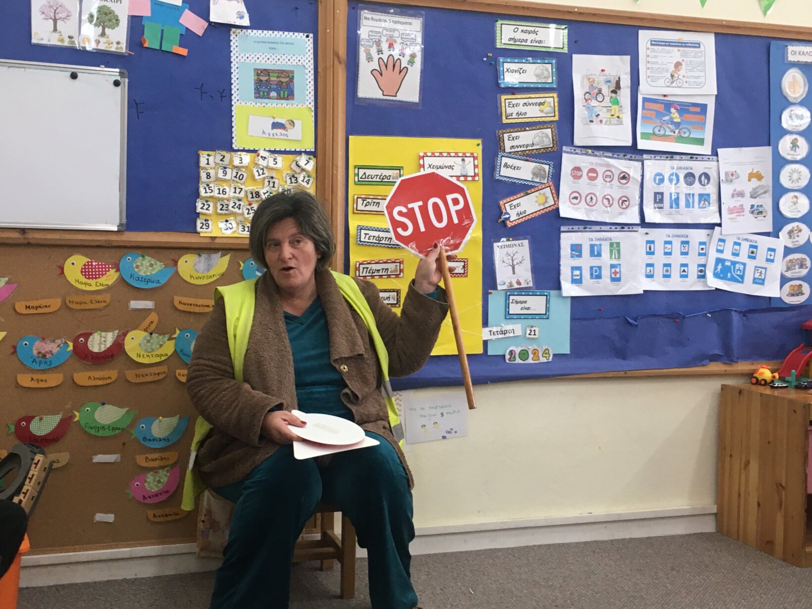 Συζήτηση με τη σχολική τροχονόμο και διέλευση με τη βοήθεια της από την διάβαση πεζών.