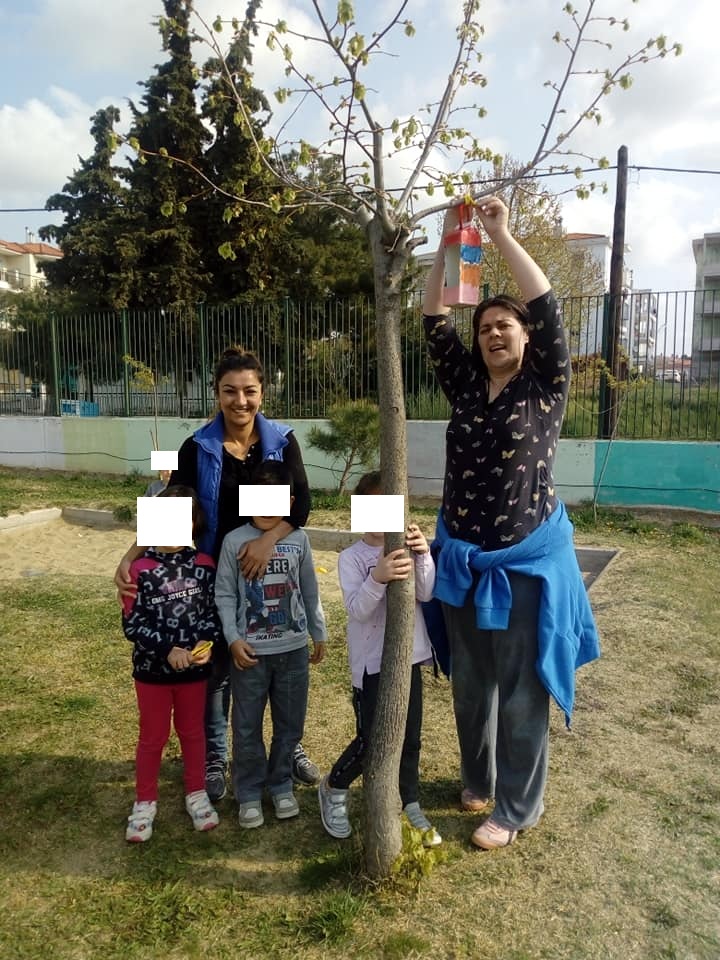 Κρεμάσαμε στα δέντρα της αυλής του νηπιαγωγείου μας φωλιές/ταΐστρες που είχαν φτιάξει τα παιδιά μαζί με τους γονείς τους τις προηγούμενες μέρες.