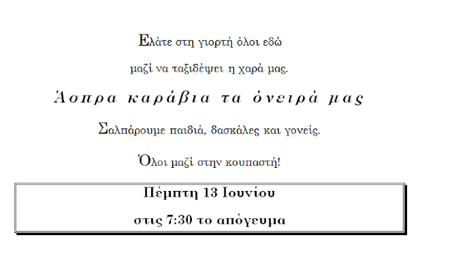 1. Στα πλαίσια της συμμετοχής του Σχολείου μας στο Lets Do It Greece 2019 στον άξονα: «Νοιάζομαι για τον κοινότητα»,επισκεφθήκαμε με τα παιδιά το ΚΑΠΗ Επανομής όπου δωρίσαμε αντίγραφα του αυθεντικού πίνακα στους ηλικιωμένους που βρίσκονταν εκεί για να διακοσμήσουν το χώρο τους. Φωτογραφικό υλικό και σχετική ανάρτηση από την επίσκεψη μπορείτε να δείτε πατώντας εδώ.