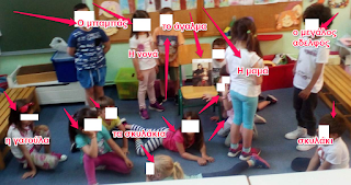 5. Σε επόμενη δραστηριότητα ζητήθηκε από κάθε παιδί χωριστά να επεκτείνει τον πίνακα, δηλαδή να ζωγραφίσει κι άλλες φιγούρες γύρω από το κεντρικό θέμα του πίνακα, είπαν και καταγράψαμε τα λόγια των νέων προσώπων, αναπαραστήσαμε με το σώμα μας τον νέο «μεγαλύτερο» πίνακα, φωτογραφηθήκαμε, φτιάξαμε ομαδικά τον καινούργιο πίνακα προσθέτοντας τα νέα πρόσωπα και προσθέσαμε σε «συννεφάκια» σε μορφή κόμικ τα λόγια του καθενός.