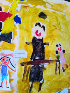 4. Επεκτείναμε τον πίνακα (τα παιδιά ζωγράφισαν ξεχωριστά το καθένα κι άλλες φιγούρες γύρω από το κεντρικό θέμα του πίνακα, είπαν και καταγράψαμε τα λόγια των νέων προσώπων, αναπαραστήσαμε με το σώμα μας τον νέο «μεγαλύτερο» πίνακα, φωτογραφηθήκαμε, φτιάξαμε ομαδικά τον καινούργιο πίνακα προσθέτοντας τα νέα πρόσωπα και προσθέσαμε σε «συννεφάκια» τα λόγια του καθενός).
