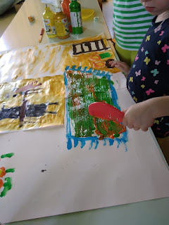 2. Τα παιδιά σε μικρές ομάδες των 3,4 ατόμων έπλασαν τις ιστορίες που φαντάζονταν πως κρύβονταν πίσω από τον πίνακα και ίσως ενέπνευσαν τον καλλιτέχνη και οι νηπιαγωγοί κινούμενοι ανάμεσα στις ομάδες κατέγραψαν τις ιστορίες των παιδιών, και στη συνέχεια εκπρόσωπος της κάθε ομάδας αφηγήθηκε την ιστορία της ομάδας του στις υπόλοιπες.