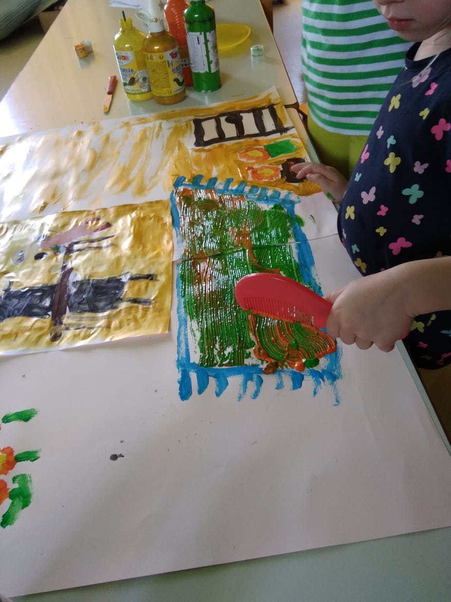 2. Τα παιδιά σε μικρές ομάδες των 3,4 ατόμων έπλασαν τις ιστορίες που φαντάζονταν πως κρύβονταν πίσω από τον πίνακα και ίσως ενέπνευσαν τον καλλιτέχνη και οι νηπιαγωγοί κινούμενοι ανάμεσα στις ομάδες κατέγραψαν τις ιστορίες των παιδιών, και στη συνέχεια εκπρόσωπος της κάθε ομάδας αφηγήθηκε την ιστορία της ομάδας του στις υπόλοιπες.