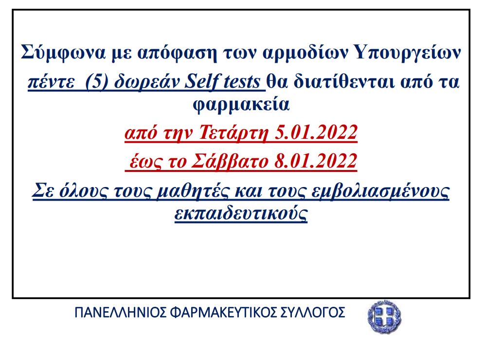 Οι μαθητές θα διενεργήσουν το selftest σήμερα, Τετάρτη 26.1.2022, και σε κάθε περίπτωση πριν την προσέλευσή