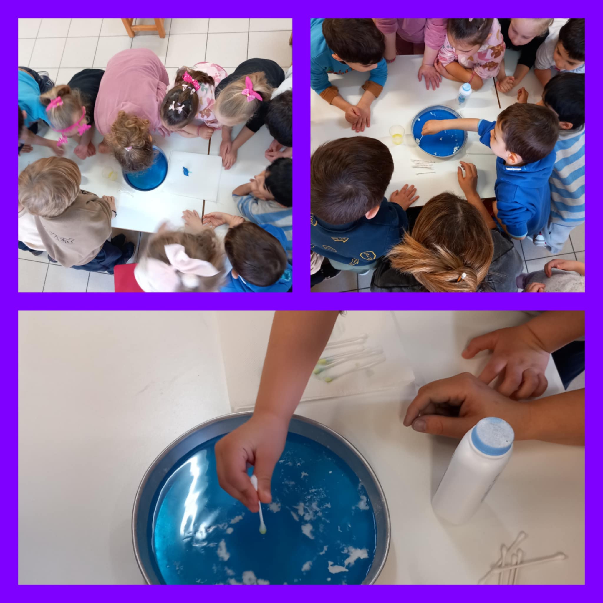 Πείραμα: Σπάσιμο πάγων με αφορμή την θεματική μας τα ζώα των πάγων. Πειραματιστήκαμε με τα παιδιά χρησιμοποιώντας νερό, χαρτί γκοφρέ μπλε, ταλκ, υγρό σαπούνι και μια μπατονέτα στο χέρι σπάμε τους πάγους.