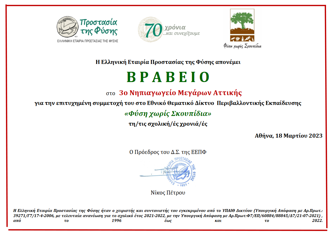 Το σχολείο βραβεύτηκε το 2023 από την ΕΕΠΦ στο δίκτυο φύση χωρίς σκουπίδια.