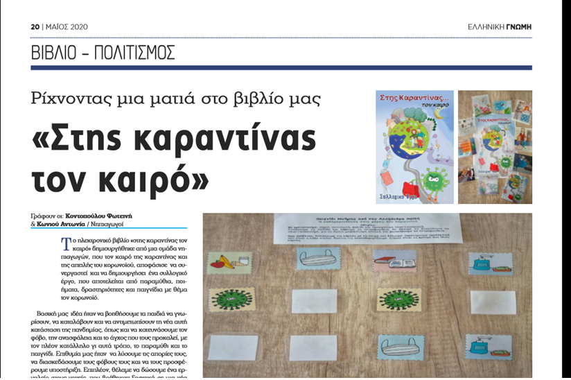 Το ηλεκτρονικό βιβλίο «στης καραντίνας τον καιρό» δημιουργήθηκε από μια ομάδα νηπιαγωγών, που τον καιρό της καραντίνας και της απειλής του κορωνοϊού, αποφάσισε να συνεργαστεί και να δημιουργήσει ένα συλλογικό έργο, που αποτελείται από παραμύθια, ποιήματα, δραστηριότητες και παιχνίδια με θέμα τον κορωνοϊό. Το βιβλίο αυτό το παρουσιάσαμε στην εφημερίδα Ελληνική Γνώμη που εδρεύει στο Βερολίνο.