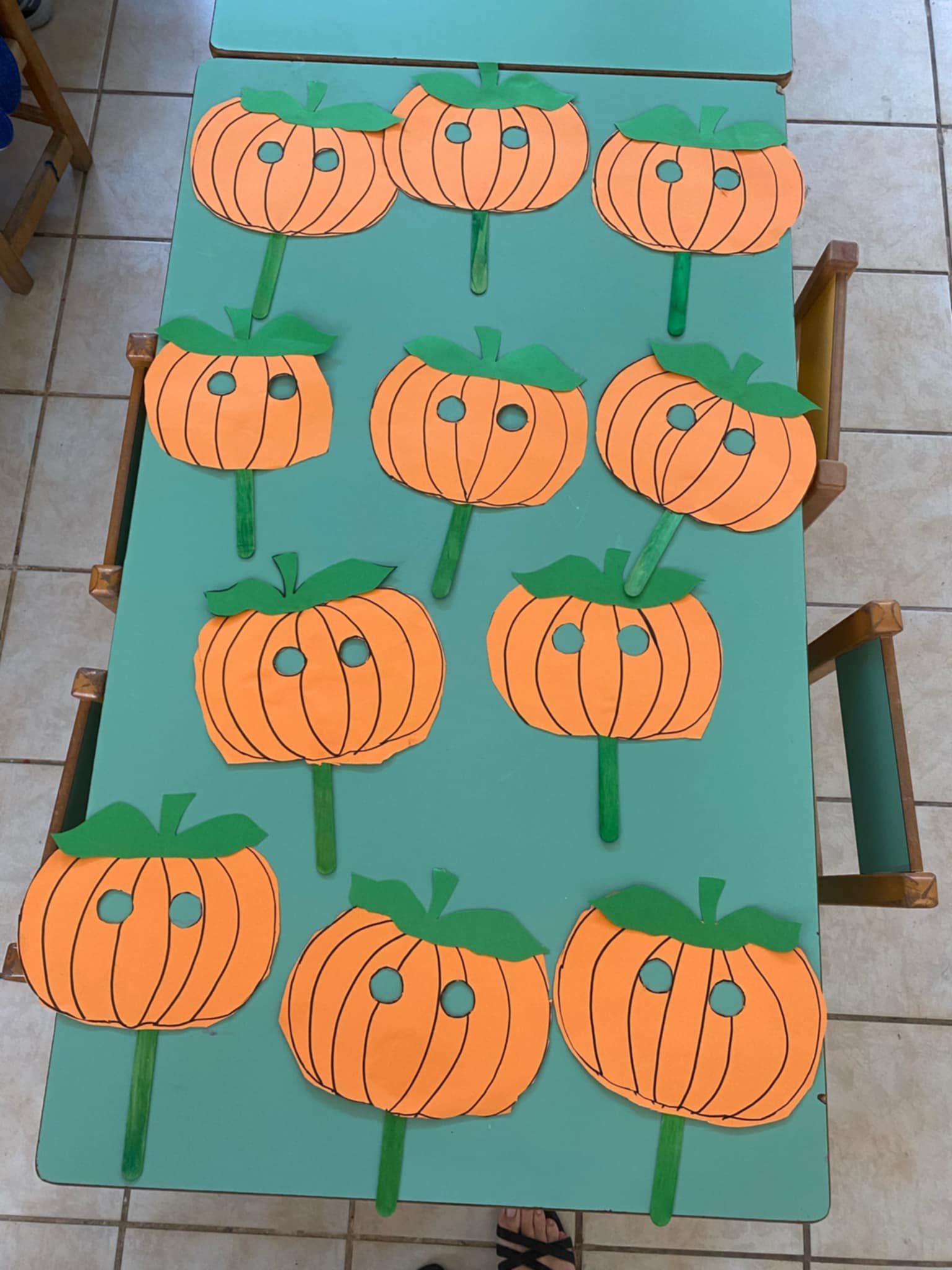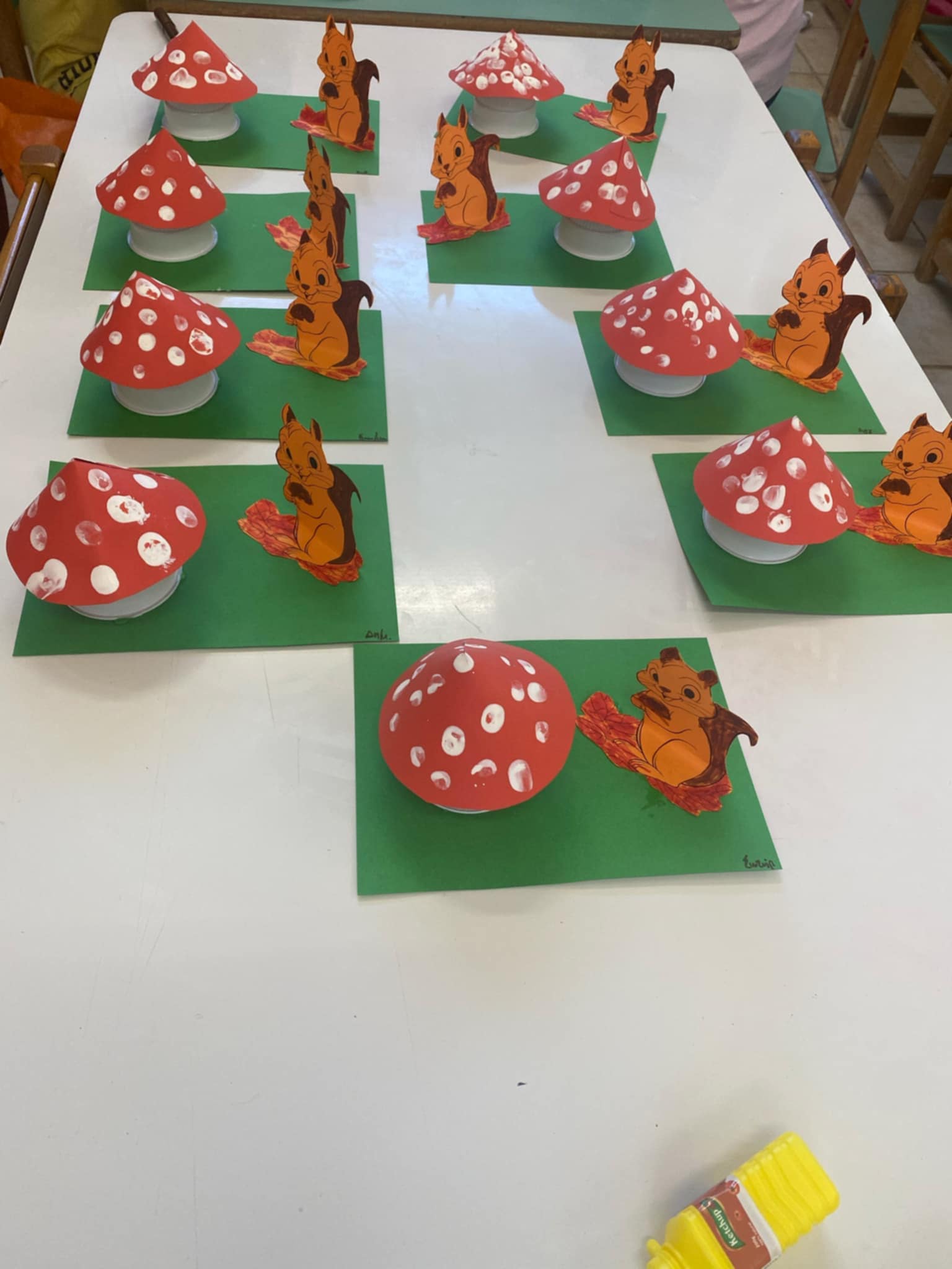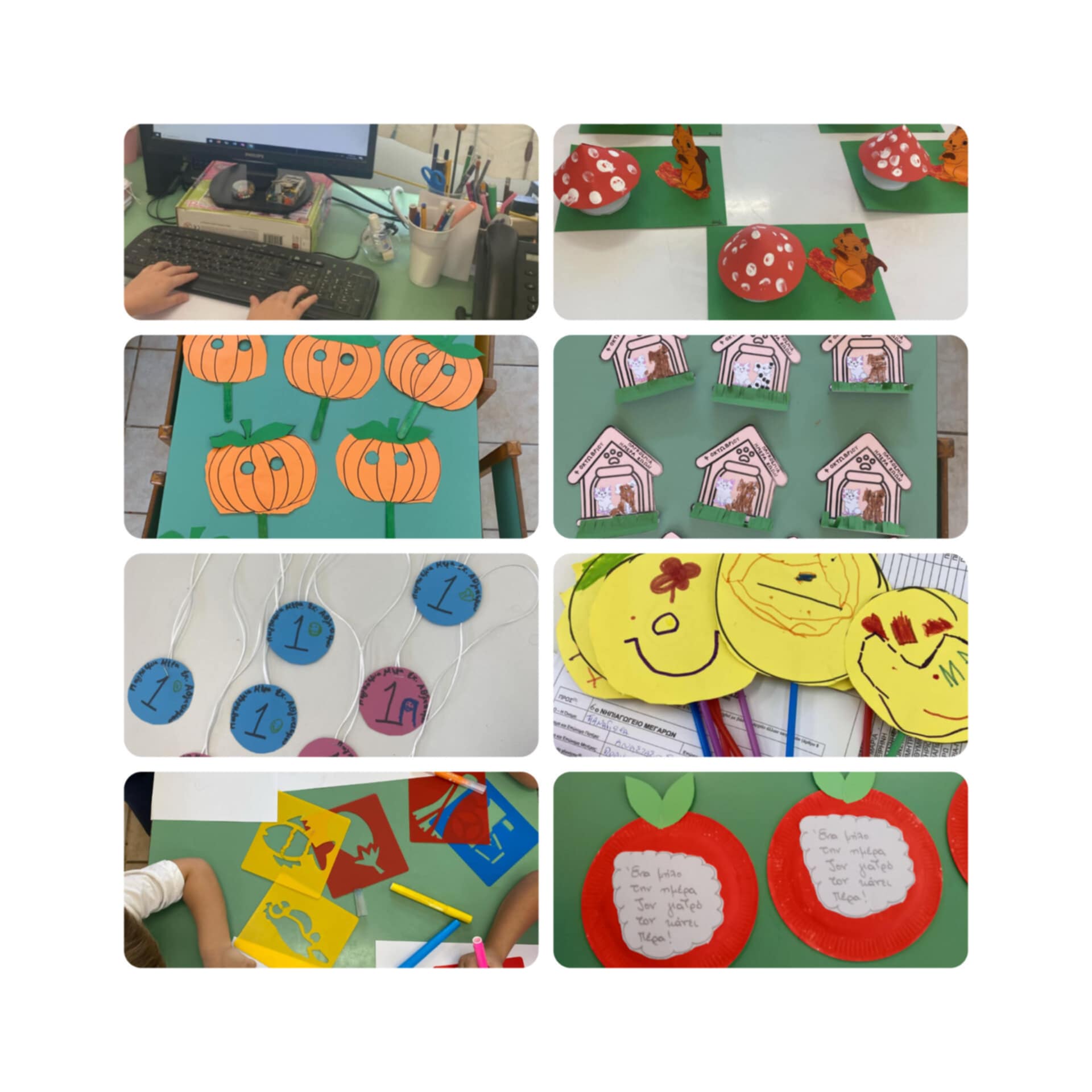 Ξεκινώντας το Φθινόπωρο ως θεματική ενότητα φτιάξαμε με χαρτάκι πορτοκαλί μασκούλες, κατασκευούλα με μανιταράκι και σκυλάκι σε τρισδιάστατη μορφή καθώς και τα μήλα του Φθινοπώρου αφού βάψαμε πιατάκια και προσθέσαμε το γνωστό ρητό