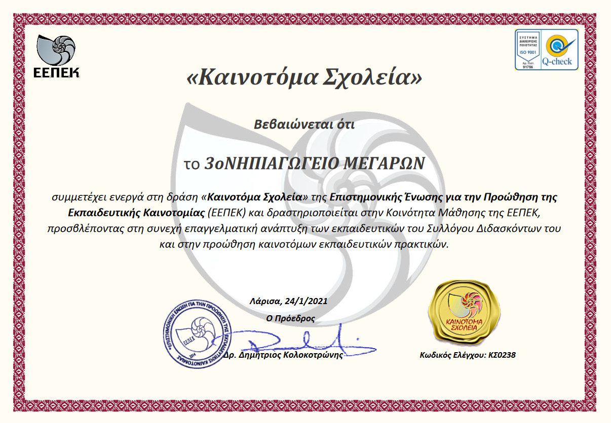 Το 2021 το σχολείο μας εντάχθηκε στα καινοτόμα σχολεία και έτσι λάβαμε και την αντίστοιχη βεβαίωση.