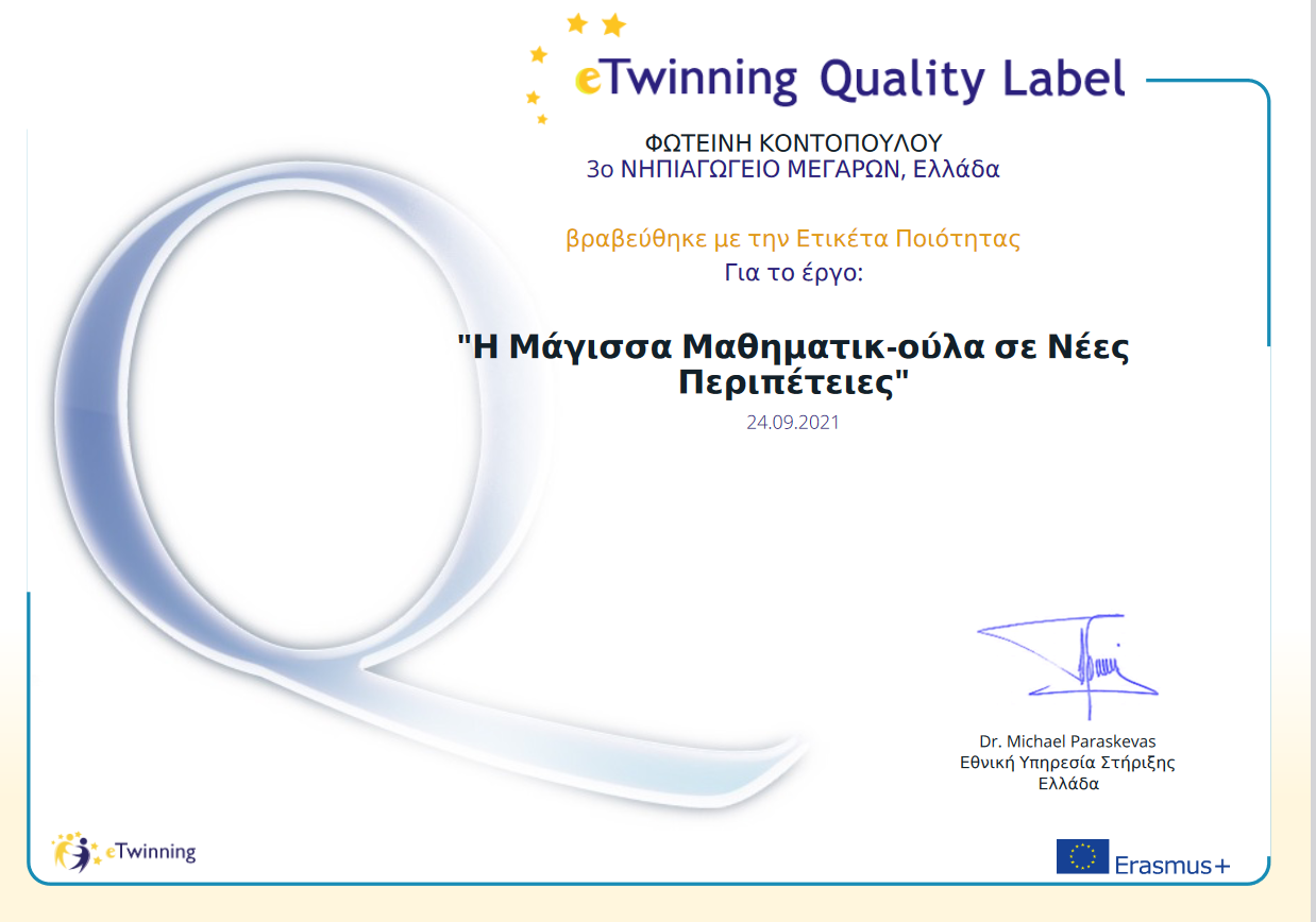 Το έργο βραβεύτηκε με την ετικέτα ποιότητας με την λήξη της σχολικής χρονιάς.