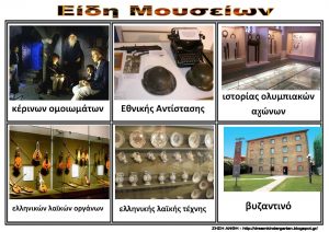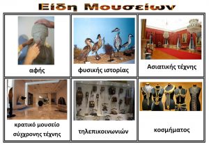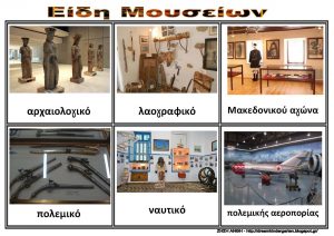 Αρχικά μπορούμε να παρατηρήσουμε εικόνες με τα είδη των μουσείων που συναντάμε και να συζητήσουμε με τα παιδιά κάνοντας ερωτήσεις όπως: – Τί είναι το μουσείο; · Τι έχει μέσα ένα μουσείο; · Υπάρχουν πολλά και διαφορετικά μουσεία; · Γιατί οι άνθρωποι βάζουν τα παλιά αντικείμενα σε μουσεία; · Γιατί βάζουν τα αγγεία και τα νομίσματα σε βιτρίνες; · Τί είναι άγαλμα; · Από τι είναι φτιαγμένο ένα άγαλμα; · Πού βρίσκουμε τα αρχαία; · Ποιοι τα βρίσκουν και πώς;.(μας βοηθούνε στη συζήτηση αρκετά οι εικόνες παρακάτω) .