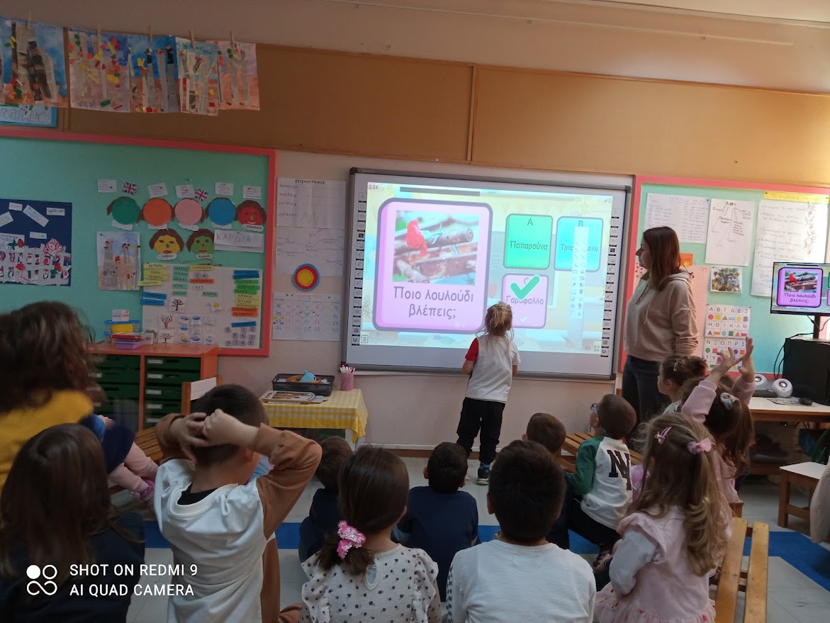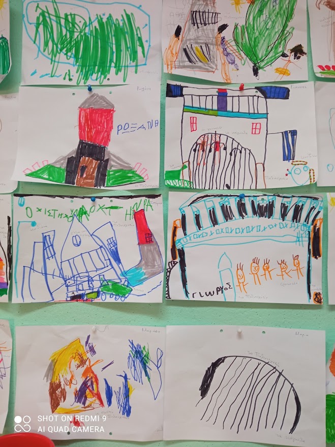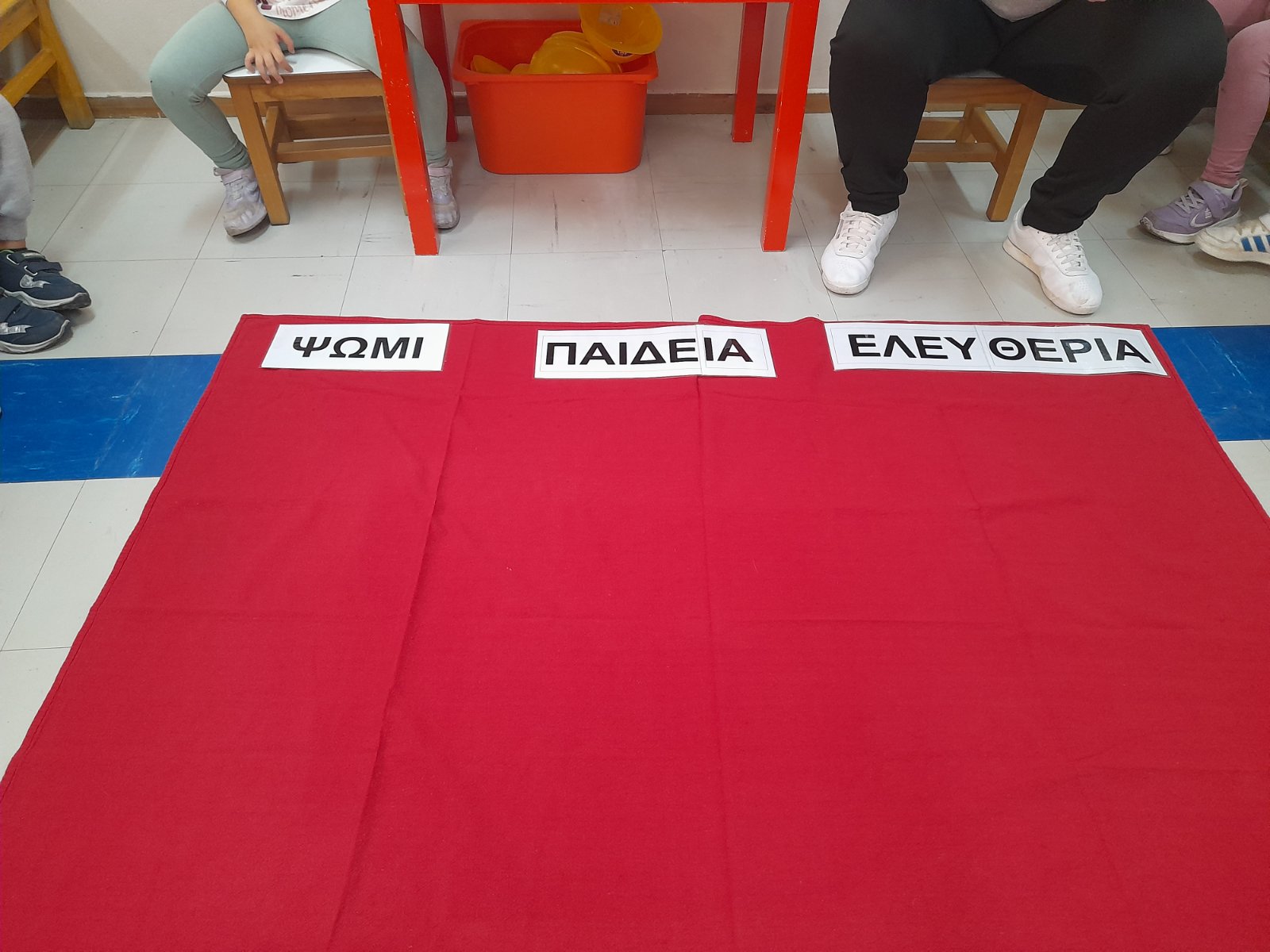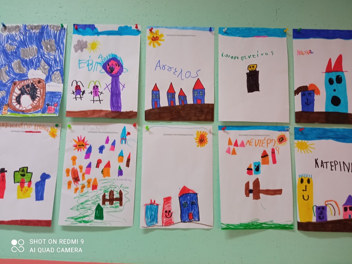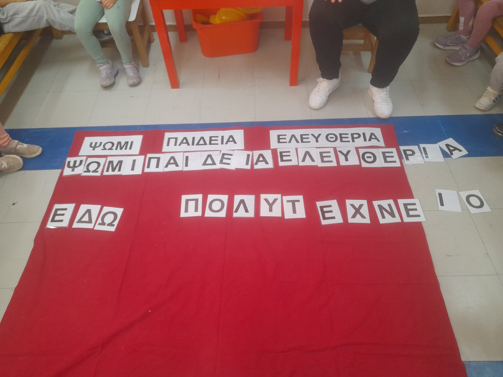Τα παιδιά γνώρισαν τα γεγονότα που έγιναν στις 17 Νοέμβρη 1973 στο Πολυτεχνείο, τις έννοιες Δημοκρατία-Δικτατορία ,τα τραγούδια, τα συνθήματα των φοιτητών και τα αναλύσαμε μέσα από εποπτικό υλικό και στη συνέχεια τα αποτύπωσαν εικαστικά με ατομικές και ομαδικές κατασκευές.
