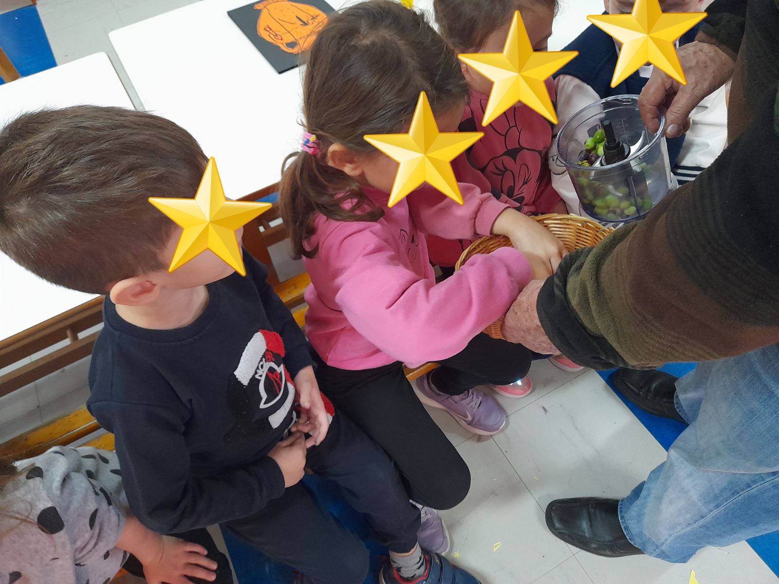 Ραβδίσαμε, χτενίσαμε και μαζέψαμε τις ελιές. Στη συνέχεια, στο λιοτρίβι του σχολείου με τη βοήθεια του κ. Γιώργου είδαμε τη διαδικασία της παραγωγής του ελαιόλαδου και μάθαμε για τις χρήσεις του.