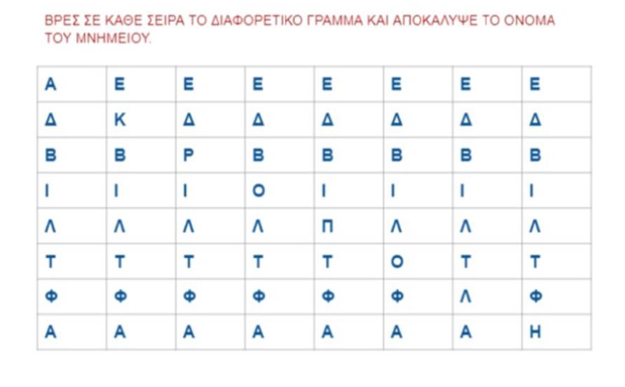 3. να βρουν σε κάθε σειρά γραμμάτων το διαφορετικό και βάζοντάς τα στη σειρά να διαβάσουν το όνομα της Ακρόπολης,