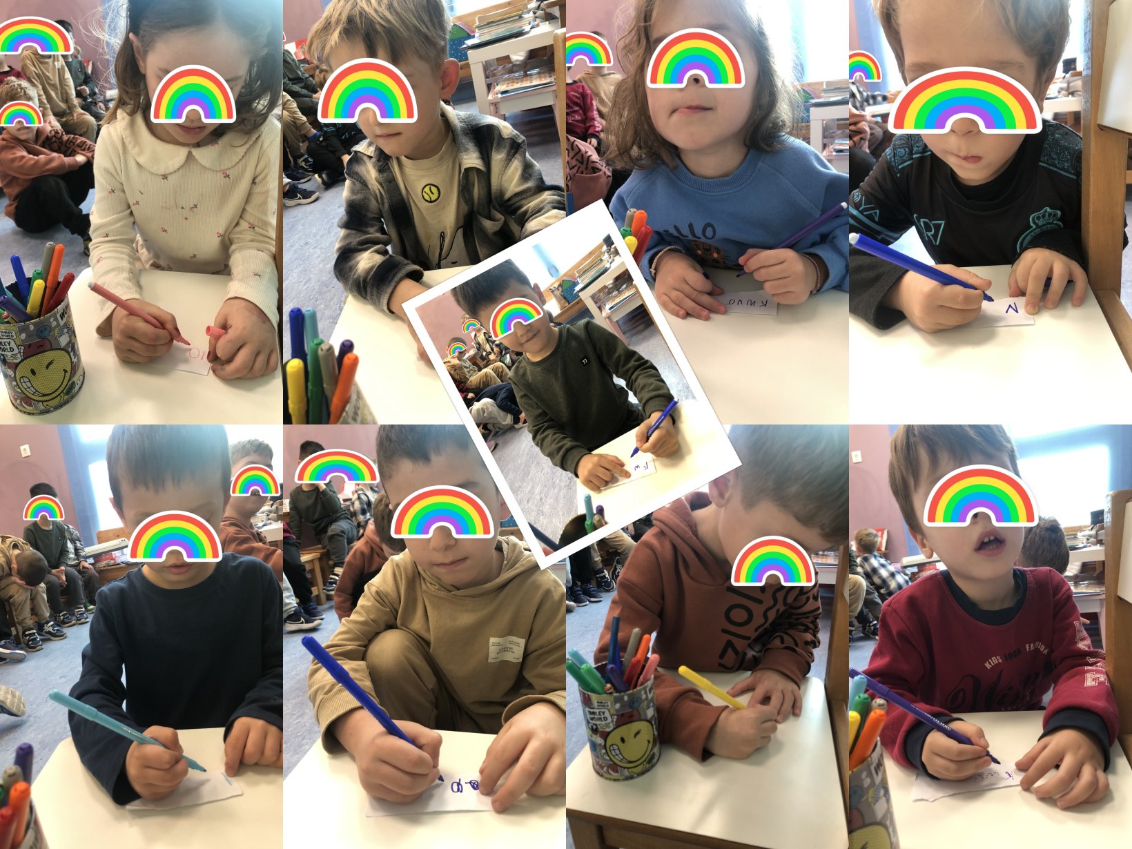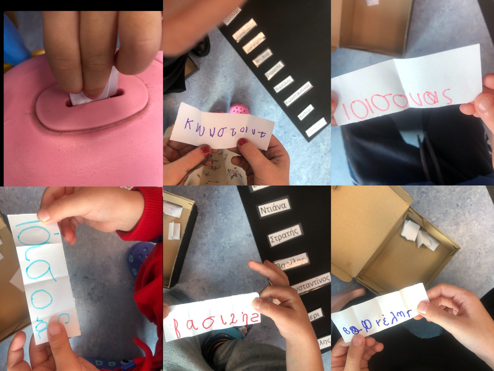 Παράλληλα, τα παιδιά του Ολοήμερου κατασκεύασαν και αυτά μάσκες με τους ήρωες της Ντενεκεδούπολης καθώς επίσης και περιστέρια από χαρτόκουτα, στα ράμφη των οποίων τοποθέτησαν λέξεις-σύμβολα της δημοκρατίας, όπως το σύνθημα Ψωμί, Παιδεία, Ελευθερία, Ειρήνη, Αγκαλιές και Δικαιοσύνη. Μέσα από τη διαδικασία αυτή ενισχύθηκε η κατανόηση αφηρημένων κοινωνικών εννοιών. Επιπλέον, δημιούργησαν ένα κολάζ με αποκόμματα εφημερίδων, το οποίο απεικόνιζε το Πολυτεχνείο ως σύμβολο αντίστασης απέναντι στη δικτατορία. Η επεξεργασία εποπτικού υλικού έδωσε την ευκαιρία για πρώιμη εξοικείωση και την κατανόηση των γεγονότων του Πολυτεχνείου. Σε επίπεδο εννοιών, ιδιαίτερη βαρύτητα δόθηκε στη διάκριση μεταξύ δημοκρατίας και δικτατορίας. Μέσα από ανάγνωση και ανάλυση παραμυθιών, με απλό και κατανοητό τρόπο, τα παιδιά διερεύνησαν τα χαρακτηριστικά των δύο συστημάτων: η δημοκρατία ως τρόπος οργάνωσης όπου όλοι έχουν δικαίωμα στη γνώμη, στον διάλογο και στη συμμετοχή, και η δικτατορία ως καθεστώς όπου λίγοι αποφασίζουν για όλους, περιορίζοντας την ελευθερία. Η συζήτηση αυτή συνδέθηκε με την καθημερινή ζωή της τάξης, ενισχύοντας την ανάπτυξη της κοινωνικής ευθύνης και της ενσυναίσθησης. Για να αποκτήσουν βιωματική εμπειρία της δημοκρατικής διαδικασίας, οργανώθηκαν εκλογές μέσα στην τάξη, στις οποίες τα παιδιά ψήφισαν ποιο παιδί θα ήθελαν για αρχηγό τους. Οι εκλογές θα συνεχιστούν μέχρι να γίνουν όλοι οι μαθητές αρχηγοί της τάξης. Με αυτόν τον τρόπο προσπαθήσαμε να κατανοήσουμε τη σημασία της ψηφοφορίας, της επιχειρηματολογίας, του σεβασμού της πλειοψηφίας αλλά και της αξίας της Δημοκρατίας.