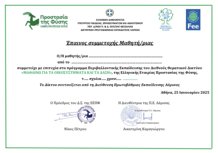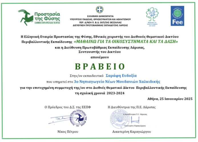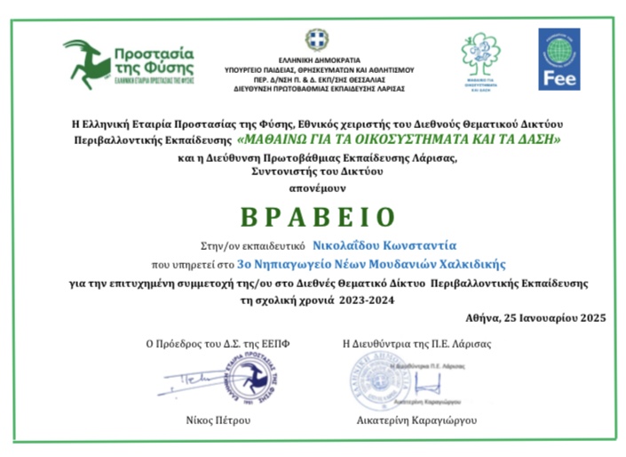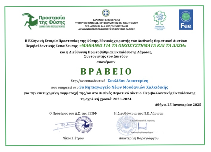 Βράβευση του Νηπιαγωγείου μας από την Ελληνική Εταιρεία Προστασίας της Φύσης