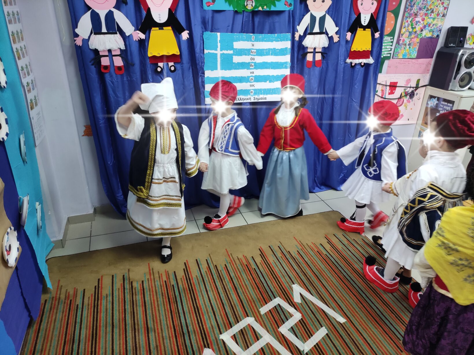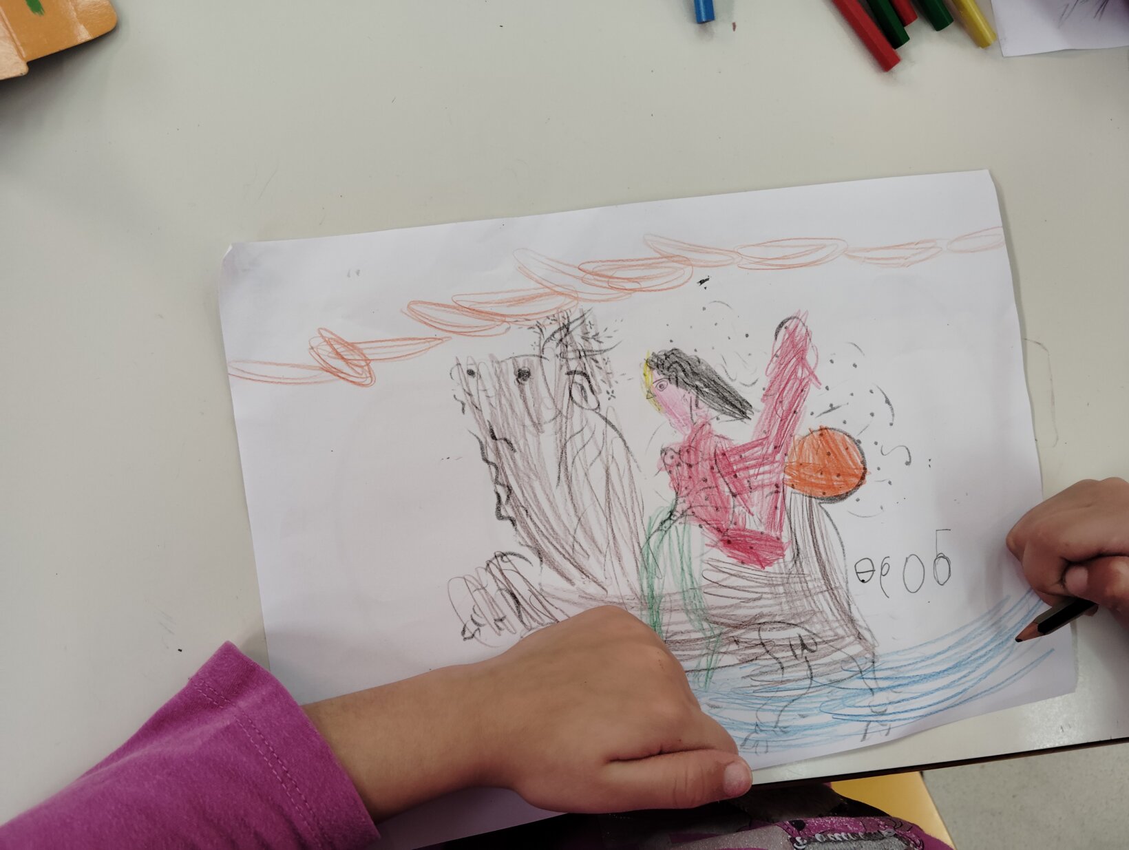 Επίσης μιλήσαμε για την Ευρώπη, την ήπειρο που ζούμε και για το μύθο της αρπαγής της από τον Δία, ο οποίος για την αγάπη της μεταμορφώθηκε σε ταύρο. Δραματοποιήσαμε την ωραία ιστορία και τη φιλοτεχνήσαμε πιάνω στον πίνακα του εικαστικού Γεωργίου Σταθόπουλου.