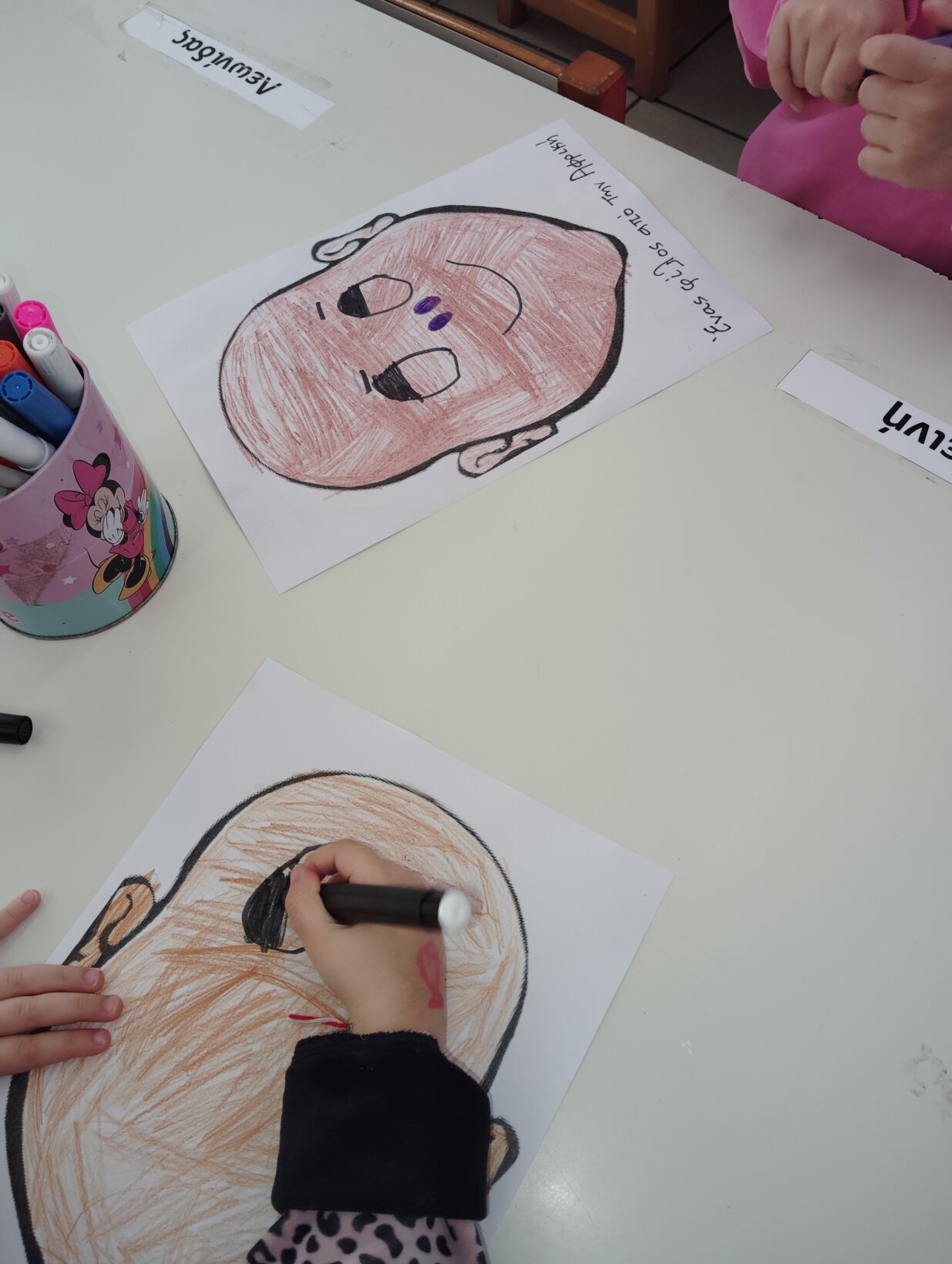 Ολοκληρώσαμε το ταξίδι μας με τις φυλές του κόσμου μιλώντας για την λευκή φυλή, στην οποία ανήκουμε εμείς. Παρατηρήσαμε τα χαρακτηριστικά μας, τις ομοιότητες και τις διαφορές μας και στη συνέχεια φτιάξαμε το πορτρέτο ενός φίλου μας αποτυπώνοντας με ακρίβεια το χρώμα των ματιών, το χρώμα και το μήκος των ματιών.