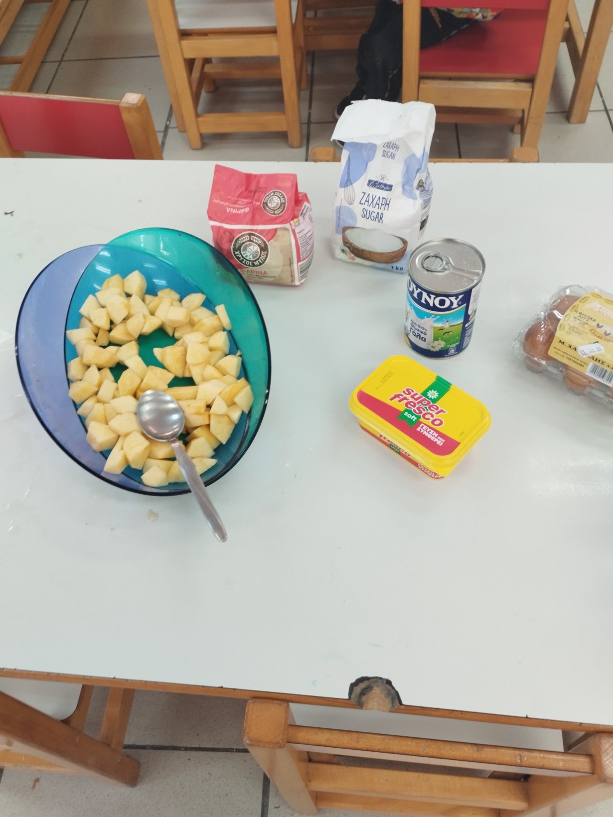 Ημέρα μαγειρικής σήμερα φορέσαμε ποδιά και σκούφο του σεφ και αποφασίσαμε να φτιάξουμε μηλόπιτα . Ενθουσιασμός μεγάλος!!! Γράψαμε τη συνταγή και πρόσω ολοταχώς για την εκτέλεση. Ιδού το αποτέλεσμα.