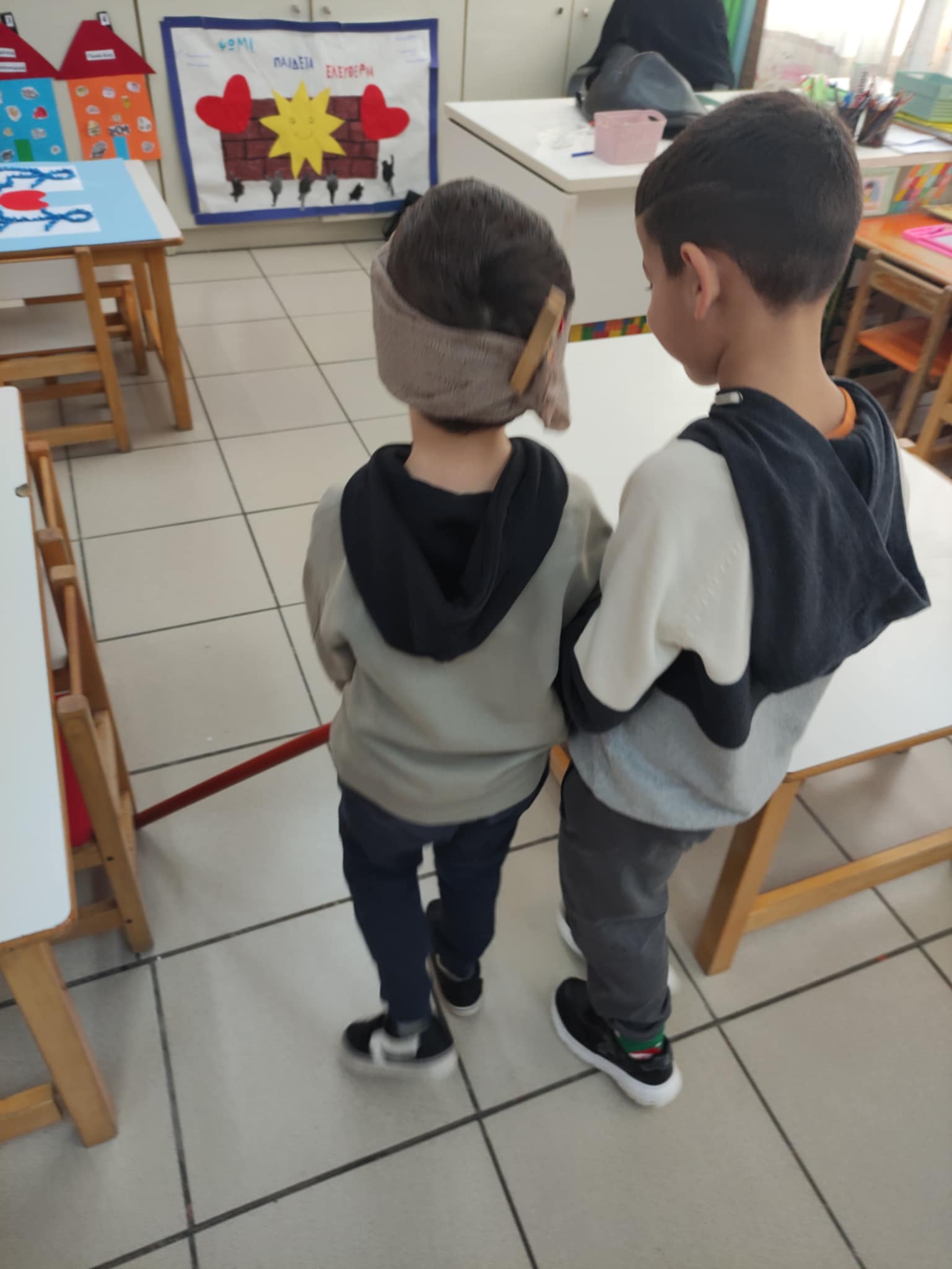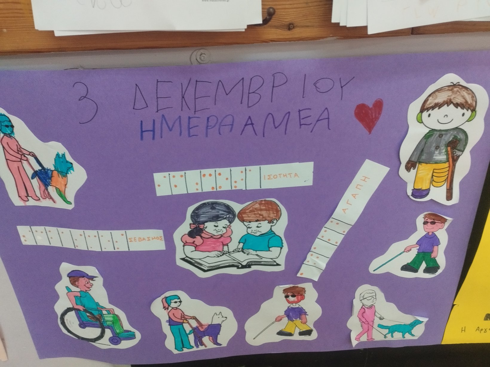 Στο νηπιαγωγείο υλοποιούνται ποικίλες δράσεις που προάγουν την ένταξη και τη στήριξη των παιδιών με αναπηρία (ΑμεΑ). Μέσα από προσαρμοσμένες εκπαιδευτικές δραστηριότητες, παιχνίδια συνεργασίας και αισθητηριακές γωνιές μάθησης, όλα τα παιδιά συμμετέχουν ισότιμα στη σχολική ζωή. Η εκπαιδευτικός ενθαρρύνει τη συνεργασία, την αποδοχή και τον σεβασμό της διαφορετικότητας, ενώ παράλληλα παρέχεται εξατομικευμένη υποστήριξη όπου χρειάζεται. Με αυτόν τον τρόπο δημιουργείται ένα περιβάλλον ασφάλειας, κατανόησης και συμπερίληψης, όπου κάθε παιδί μπορεί να αναπτύξει τις ικανότητές του και να νιώσει μέλος της ομάδας. Κατασκευάσαμε αφίσες ,εξηγήσαμε τη γραφή μπράιγ, μπήκαμε με τη βοήθεια των παιχνιδιών στη θέση των άλλων και αποκτήσαμε ενσυναίσθηση