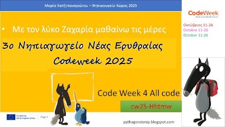 Το σχολείο μας συμμετέχει φέτος στην «Ευρωπαϊκή Εβδομάδα Προγραμματισμού CodeWeek 2025» και συγκεκριμένα στην «Εβδομάδα Προγραμματισμού για Όλους»(CODE WEEK 4 ALL) με δύο δραστηριότητες: