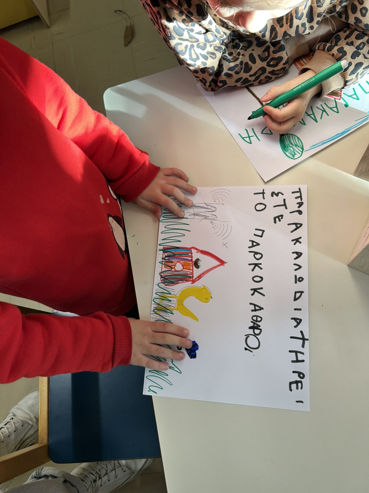 Επισκεφθήκαμε το πάρκο της γειτονιάς μας, μαζέψαμε όσα σκουπίδια εντοπίσαμε και δημιουργήσαμε αφίσες, τις οποίες αφήσαμε στον χώρο, ενθαρρύνοντας τους επισκέπτες να τον διατηρούν καθαρό. Παράλληλα, δείξαμε την αγάπη μας και για τα ζώα του πάρκου, ταΐζοντας τα πουλάκια με σποράκια και τοποθετώντας ταΐστρες στα δέντρα.