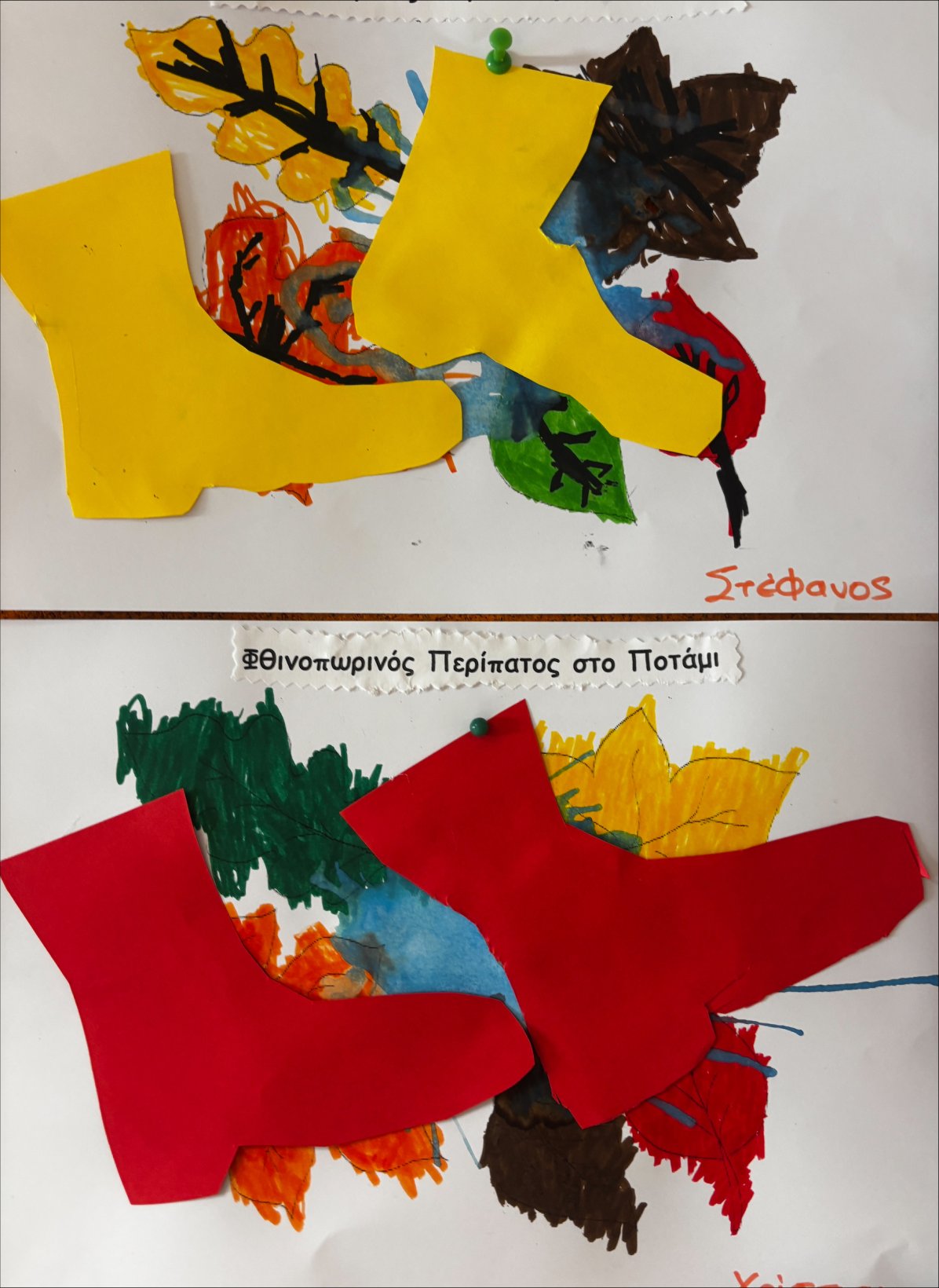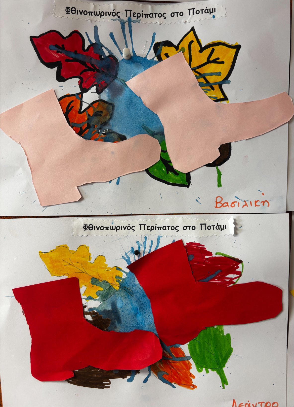 Κόψαμε και διακοσμήσαμε γαλότσες, χρωματίσαμε φθινοπωρινά φύλλα με ζεστά χρώματα και, χρησιμοποιώντας καλάμι και νερομπογιές, ζωγραφίσαμε το ποτάμι που κυλά ανάμεσα στα φύλλα. Στο τέλος, οι πολύχρωμες γαλότσες μας βρήκαν τη θέση τους «πατώντας» επάνω στα φύλλα, ολοκληρώνοντας έτσι το υπέροχο φθινοπωρινό μας τοπίο! 🍂👢💧