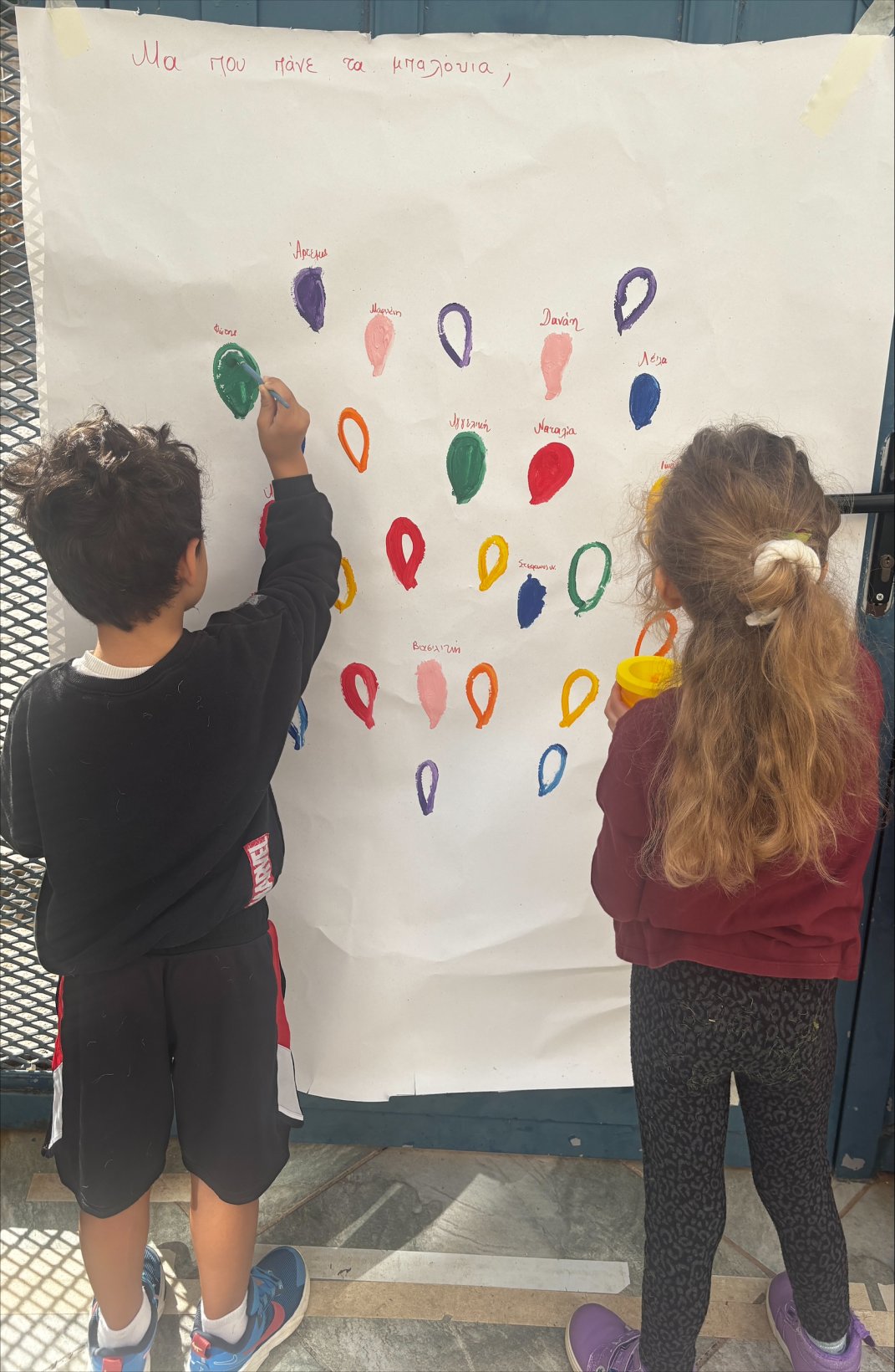 Στο νηπιαγωγείο μας, και τα δύο τμήματα συνεργάστηκαν με μεγάλο ενθουσιασμό για να δημιουργήσουν μια υπέροχη ομαδική αφίσα. Κάθε παιδί χρωμάτισε το δικό του μπαλόνι και έφτιαξε από κάτω τον εαυτό του να το κρατάει, «δένoντας» έτσι όλα τα μπαλόνια μαζί σε μια όμορφη, πολύχρωμη παρέα.