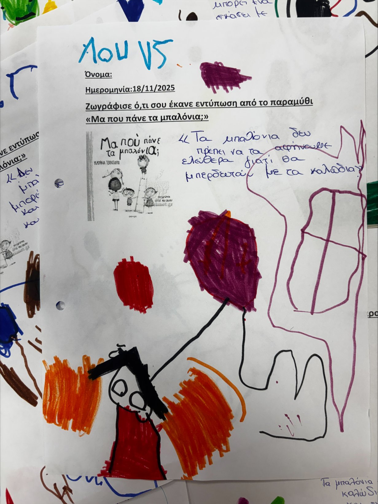 ✏️ Στη συνέχεια, οι μικροί μας μαθητές ζωγράφισαν ό,τι τους έκανε εντύπωση από το παραμύθι και εξήγησαν με δικά τους λόγια γιατί δεν πρέπει να αφήνουμε τα μπαλόνια από τα χέρια μας.