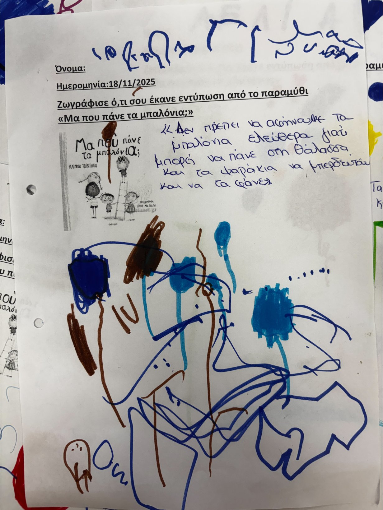 Το βιβλίο μας έδωσε την ευκαιρία να συζητήσουμε ένα σημαντικό οικολογικό μήνυμα: 🌍 Δεν αφήνουμε τα μπαλόνια να πετούν στον ουρανό, γιατί μπορούν να καταλήξουν στη θάλασσα και, όταν διαλυθούν σε μικρά κομμάτια, τα ψαράκια και άλλα θαλάσσια ζώα μπορεί να τα καταπιούν και να κινδυνεύσουν.