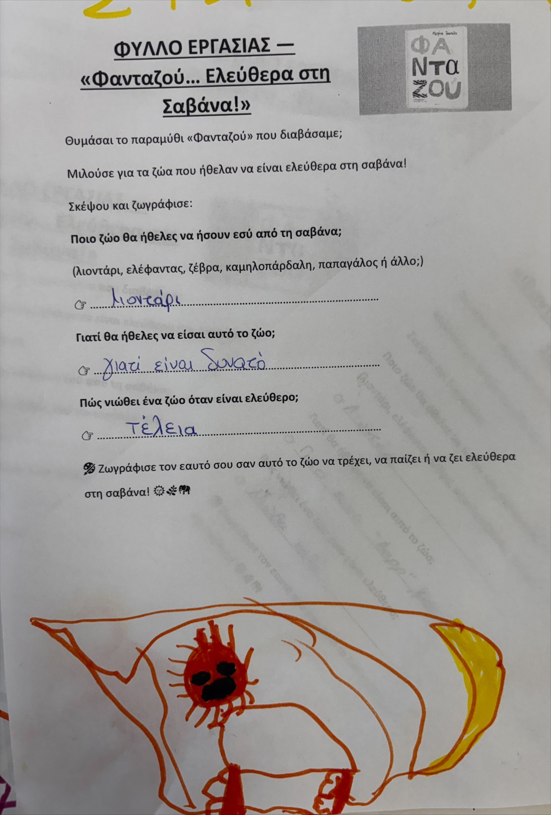 Μέσα από τη συζήτηση και τις ζωγραφιές τους, τα παιδιά εξέφρασαν πώς νιώθει ένα ζώο όταν είναι ελεύθερο και όχι μέσα σε κλουβί — χαρούμενο, δυνατό, ανέμελο και γεμάτο ζωή!