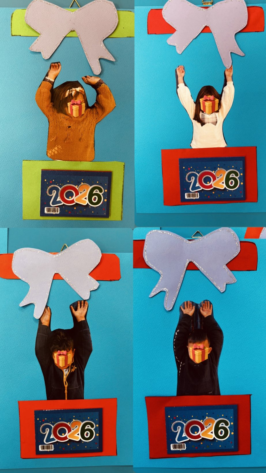 Ακόμη, τα παιδιά στόλισαν τα ξωτικογράμματά τους — το αρχικό του ονόματός τους — με χριστουγεννιάτικα χρώματα των ξωτικών: κόκκινο, πράσινο, λαχανί και κίτρινο.